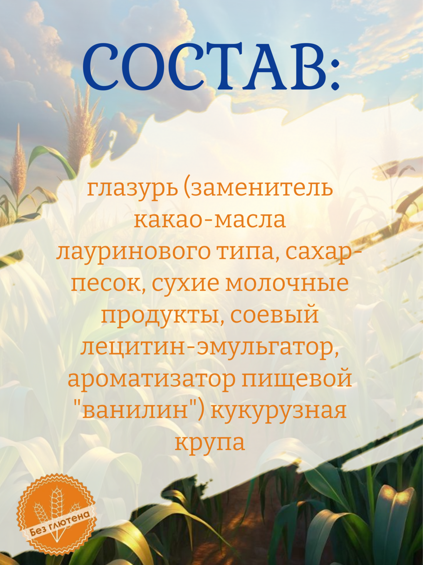 | Состав | глазурь (сахар, заменитель какао-масла лауринового типа, кокосовое масло,какао-порошок, сухие молочные продукты (сыворотка молочная), эмульгаторы (лецитин соевый - Е322, палсгаард 4125-Е476), ароматизатор "Ванилин", "карамель",кукурузная крупа. |