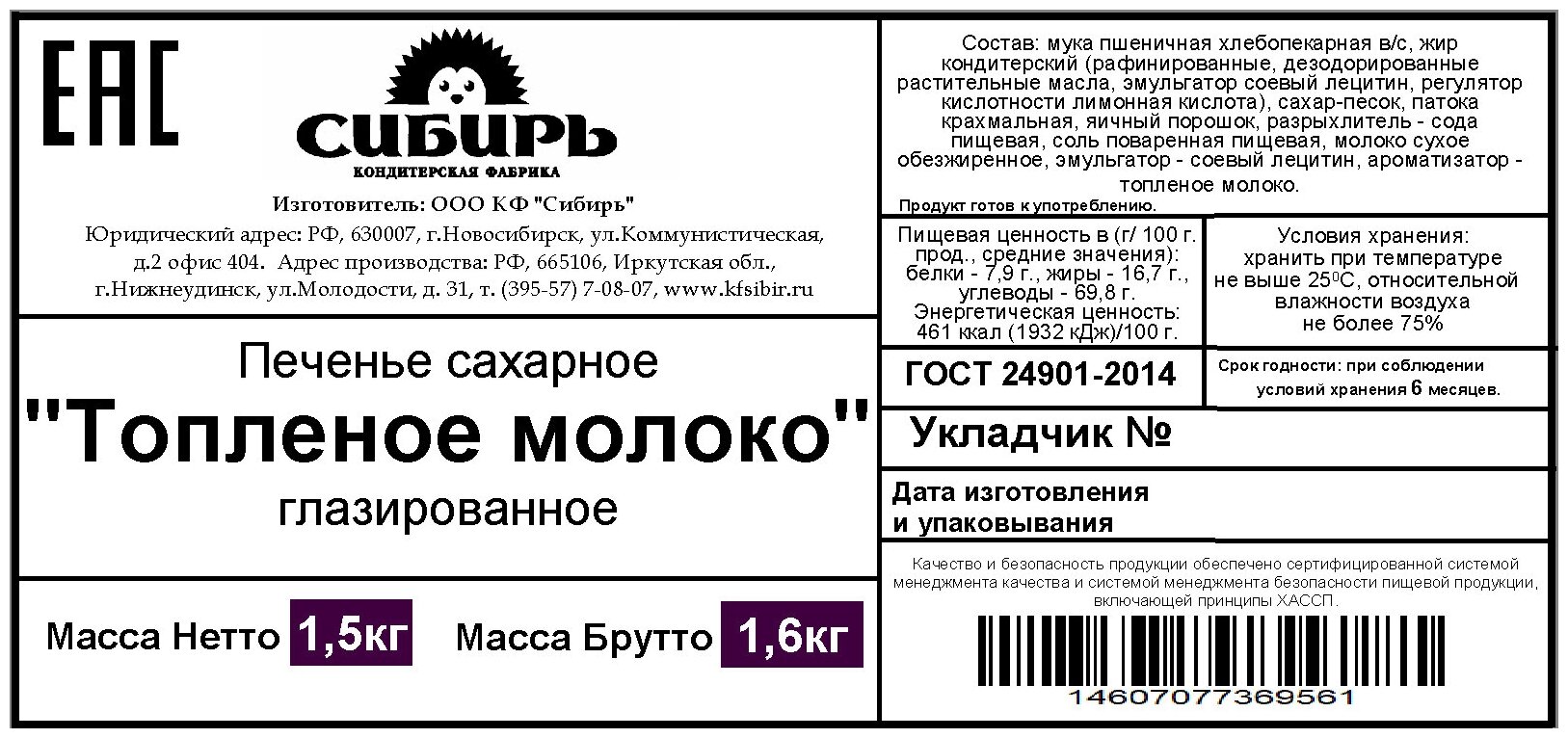 "Печенье сахарное ""Топленое молоко"" глазированное Кондитерская фабрика Сибирь, 1,5 кг" интересное: