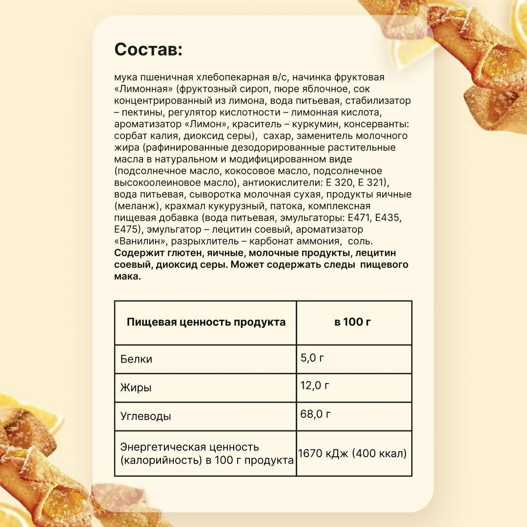 | Состав | мука пшеничная в/с, начинка фруктовая «лимонная (фруктозный сироп, пюре яблочное, сок концентрированный из лимона, вода питьевая, стабилизатор – пектины, регулятор кислотности – кислота лимонная, ароматизатор «лимон», краситель – куркумин, консерванты -сорбат калия, диоксид серы), сахар, маргарин с массовой долей общего жира (рафинированное дезодорированное растительное масло в натуральном и модифицированном виде (подсолнечное масло, кокосовое масло), вода питьевая, эмульгаторы – моно- и диглицериды жирных кислот, эфиры полиглицерина и жирных кислот, соль, ароматизатор «сливки-молоко», краситель – каротины, регулятор кислотности – кислота лимонная), молоко обезжиренное сухое, продукты яичные (меланж), крахмал кукурузный, вода питьевая, патока, разрыхлитель – карбонат аммония, ароматизатор «ванилин», соль |