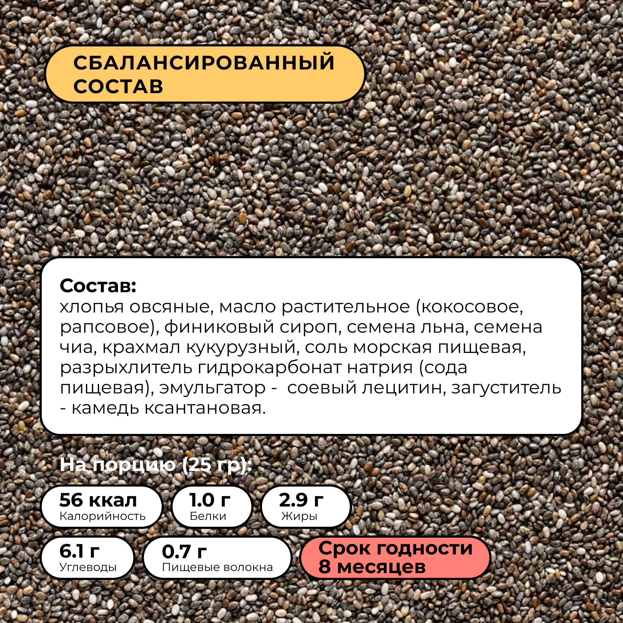 | Состав | хлопья овсяные, финиковый сироп, масло кокосовое, масло рапсовое, крахмал кукурузный, кокосовая стружка, семена чиа, разрыхлители: (пирофосфат натрия, гидрокарбонат аммония, гидрокарбонат натрия(сода пищевая)), соль морская, натуральный ароматизатор «кокос», эмульгатор - соевый лецитин, , загуститель – камедь ксантановая, подсластитель – стевизоид (экстракт стевии) . |