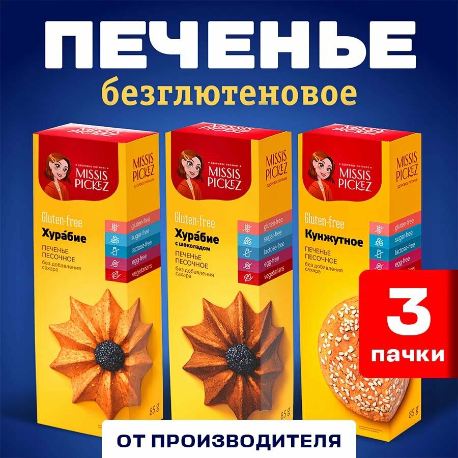 Набор печенья без глютена и лактозы "Missis Pickez" Печенье кунжутное, хурабие с шоколадом, хурабие 3 пачки по 100 г интересное:
