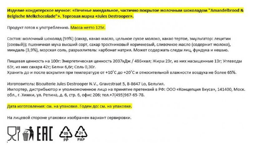 Печенье Бельгийское "Jules Destrooper" Amandelbrood & Belgische Melkchocolade, 125 грамм интересное: