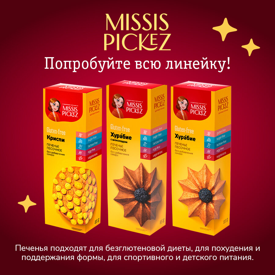 Печенье песочное "Missis Pickez" Кунжутное, хурабие, хурабие с шоколадом, криспи Без лактозы глютена и сахара Набор - 4 пачки