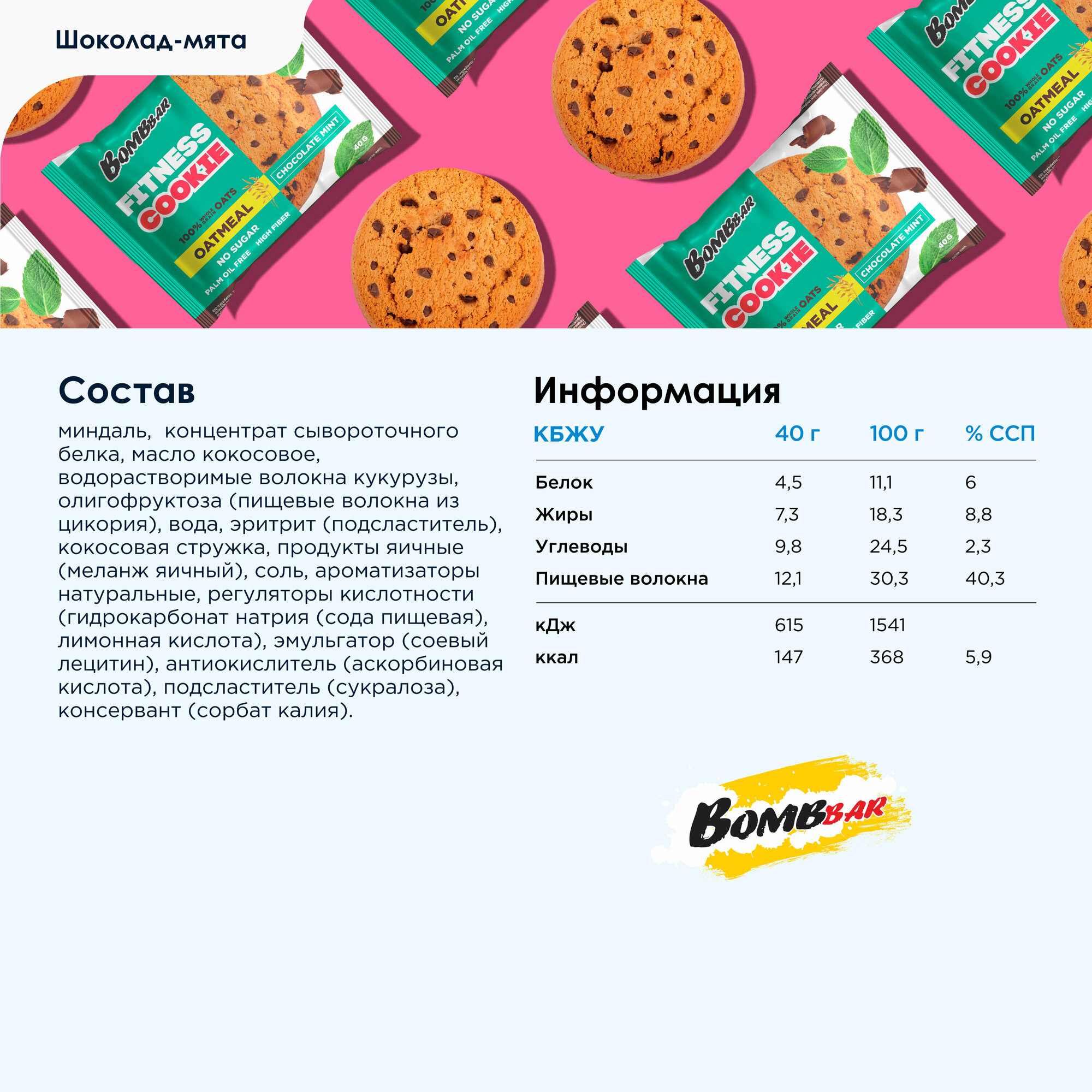 Bombbar Fitness Печенье овсяное без сахара "Шоколад - Мята", 12шт х 40г интересное: