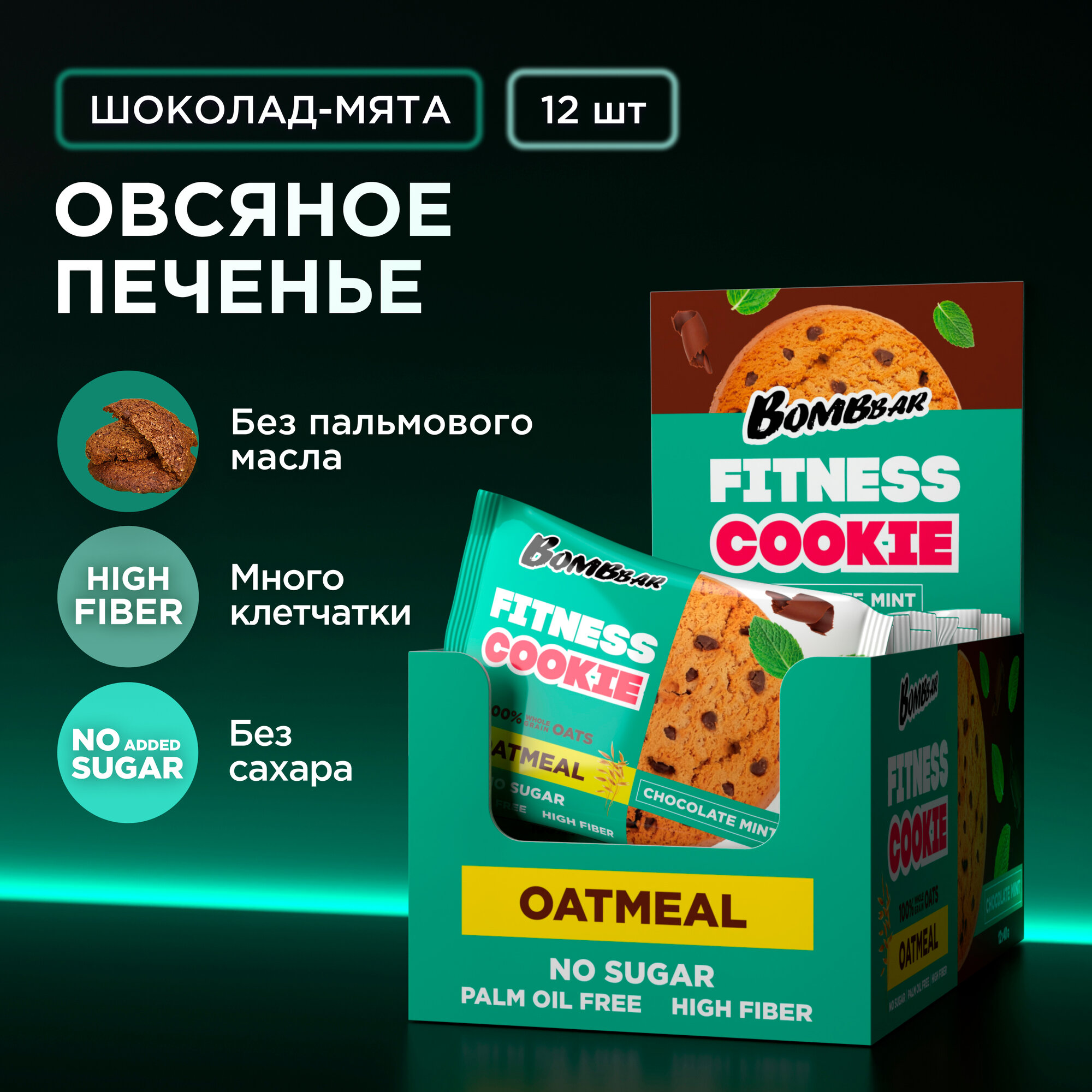 Печенье овсяное без сахара Bombbar Fitness Cookie, 12 шт по 40 г, вкус: шоколад-мята