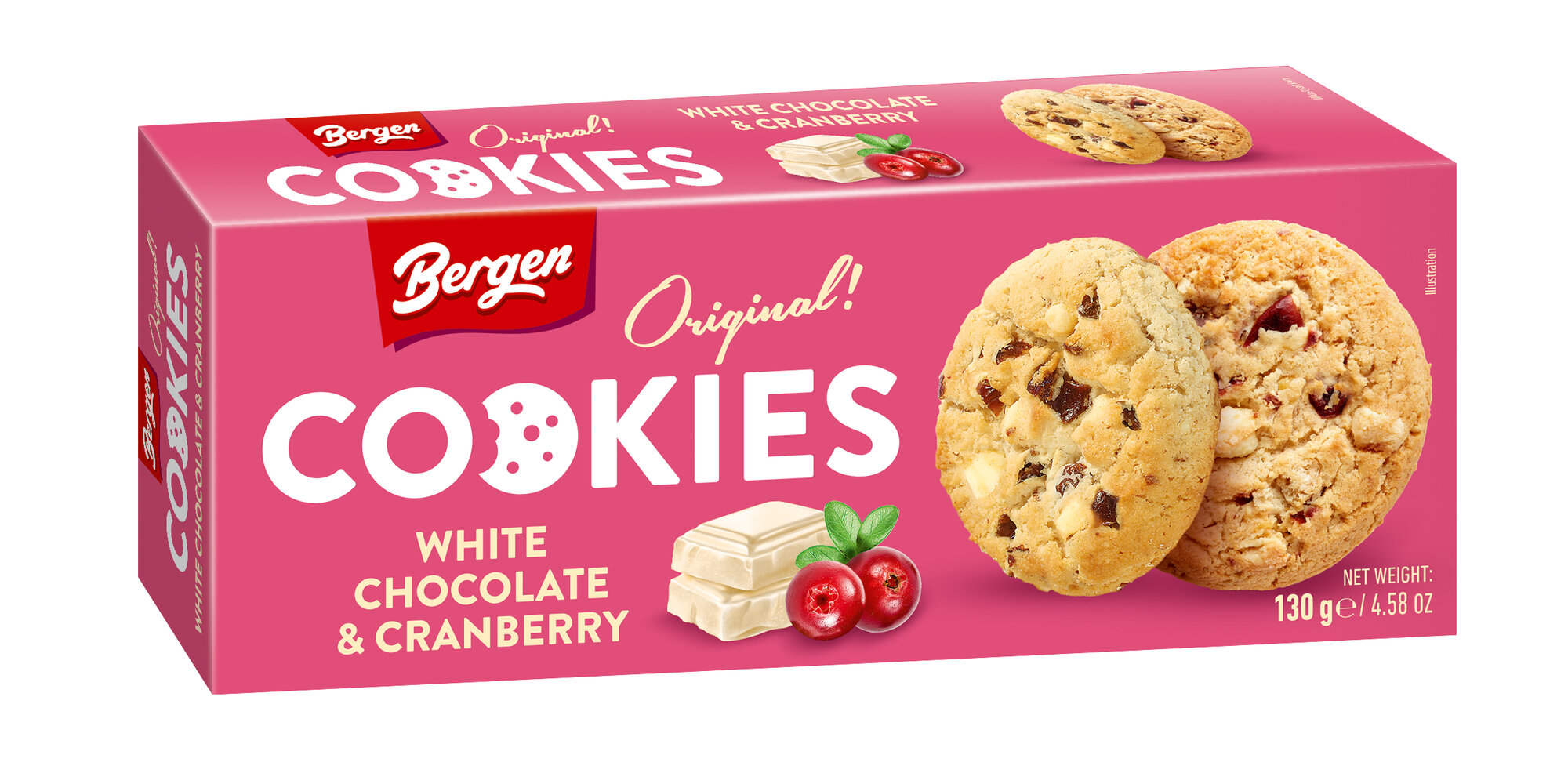 Купить Печенье BERGEN "Original cookies" с кусочками белого шоколада и клюквой, 130г