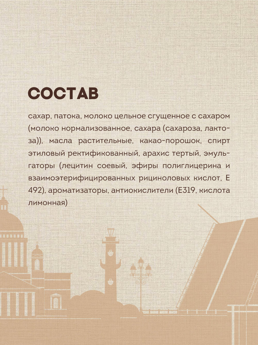 | Состав | сахар, патока, молоко цельное сгущенное с сахаром (молоко нормализованное, сахара (сахароза, лактоза)), масла растительные, какао порошок, спирт этиловый ректификованный, арахис тертый, эмульгаторы (лецитин соевый, эфиры полиглицерина и взаимоэтерифицированных рициноловых кислот, E492), ароматизаторы, антиокислители (Е319, лимонная кислота) |