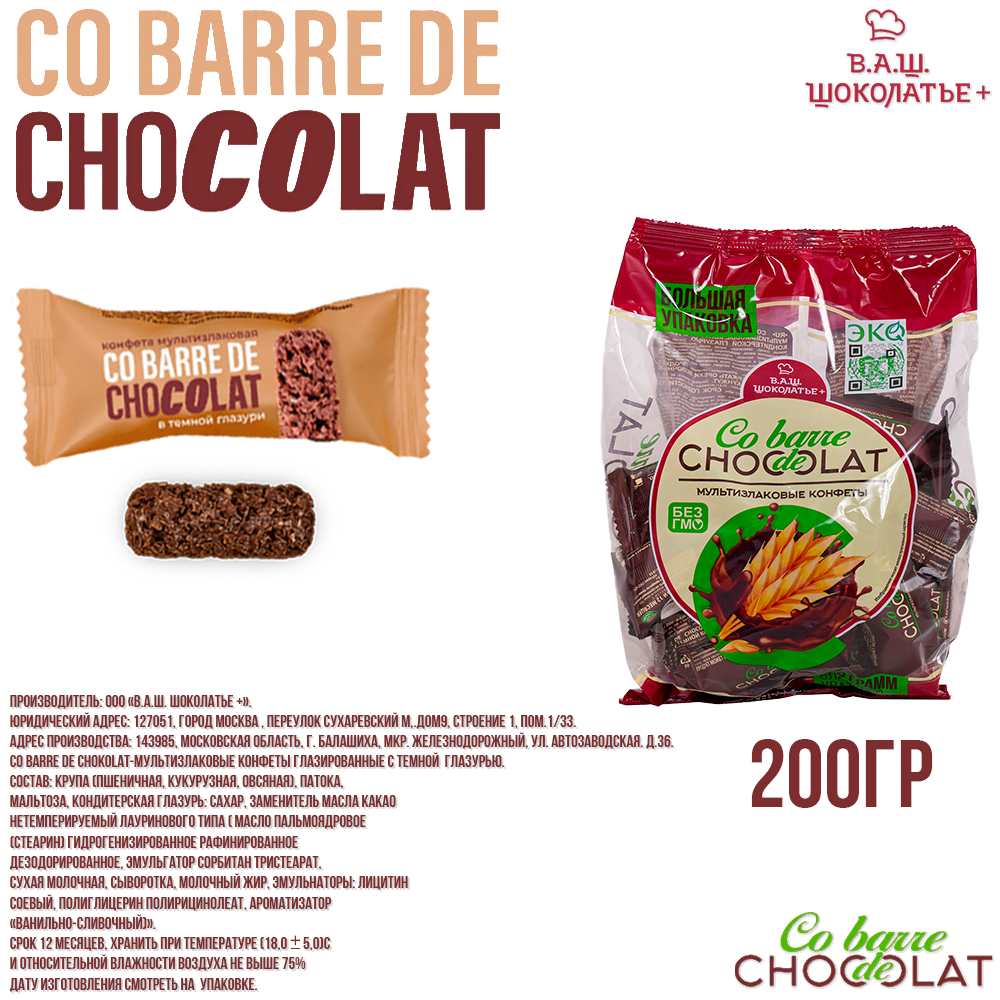 Конфеты В.А.Ш. Шоколатье Co barre de Chocolat (Кобардье) мультизлаковые с темной глазурью, 400 г