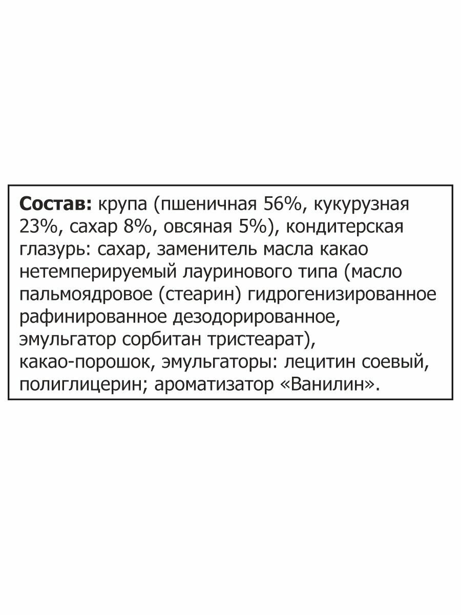 | Состав | крупа (пшеничная 56%, кукурузная 23%, сахар 8%, овсяная 5%), кондитерская глазурь: сахар, заменитель масла какао нетемперируемый лауринового типа (масло пальмоядровое (стеарин) гидрогенизированное рафинированное дезодорированное, эмульгатор сорбитан тристеарат), какао-порошок, эмульгаторы: лецитин соевый, полиглицерин; ароматизатор «Ванилин»; продукт может содержать следы орехов, молочных продуктов |