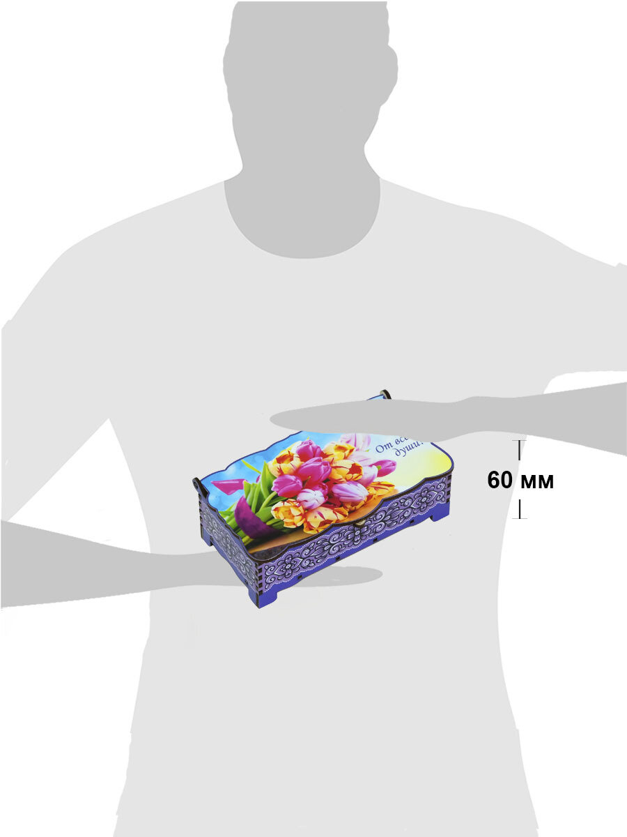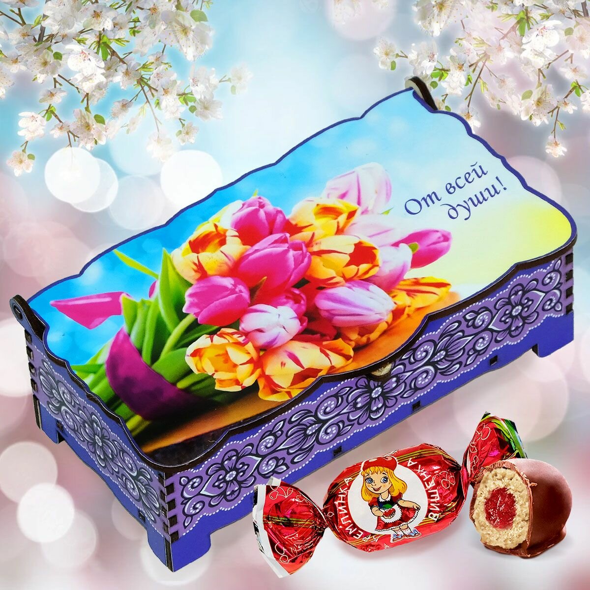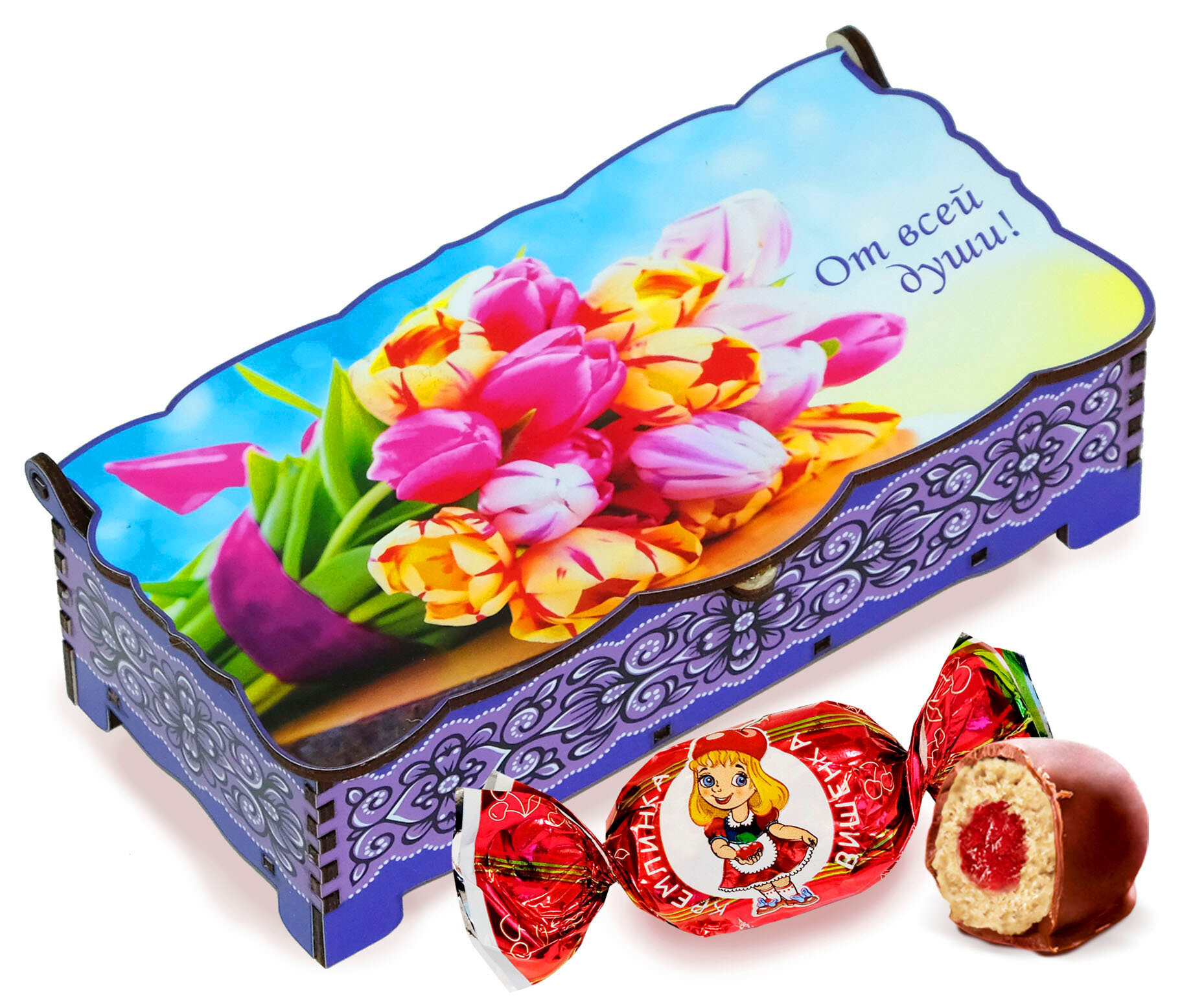 Подарок на Новый Год, набор конфет подарочных с вишневой начинкой Кремлинка Вишенка в резной шкатулке с тюльпанами "От всей души" , 150 грамм