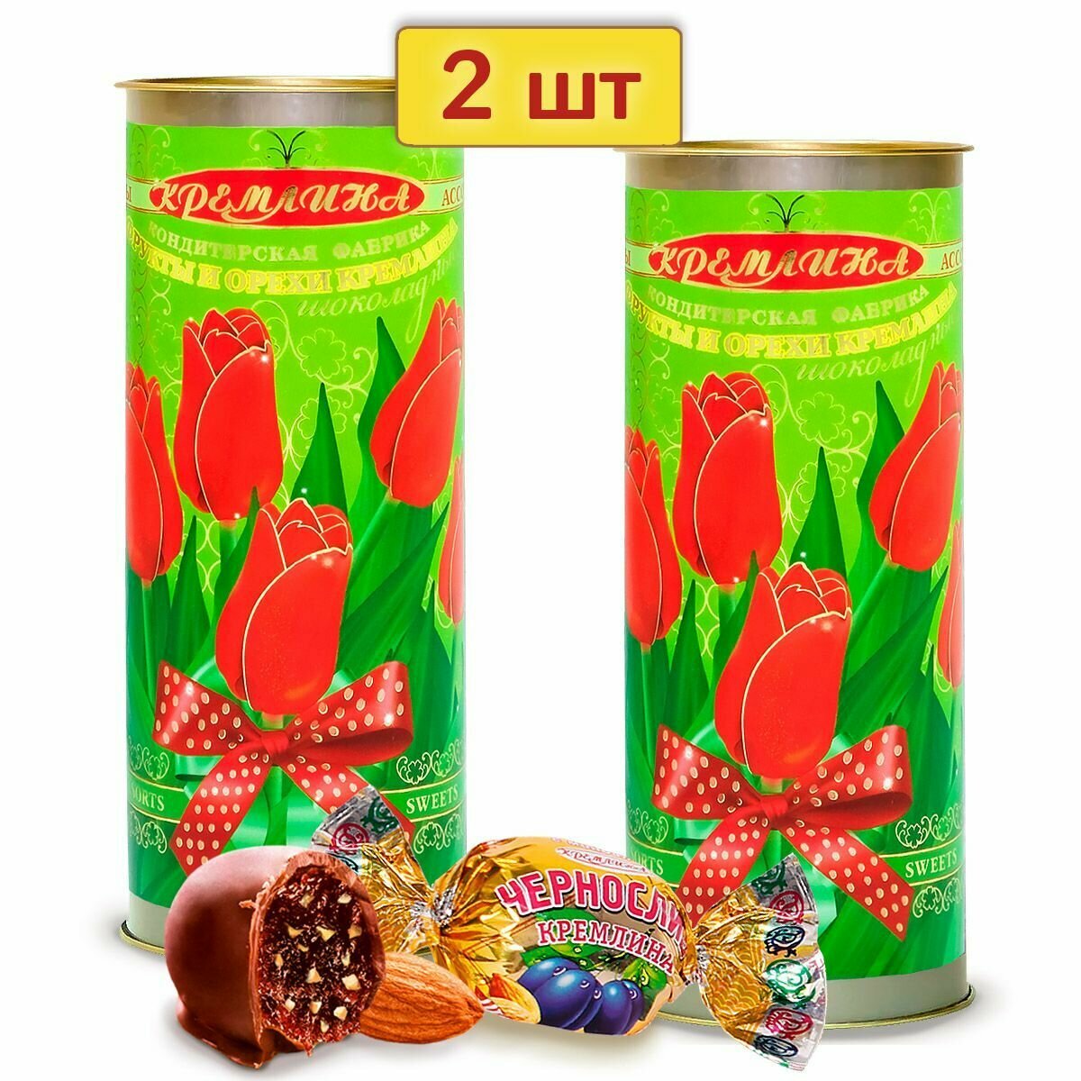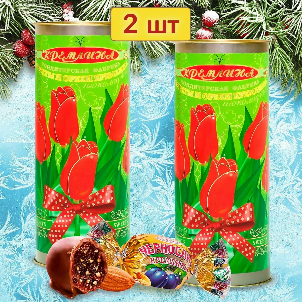 Подарок новогодний, набор конфет подарочных Чернослив шоколадный с грецким орехом в тубах "Москва Золотая" , спайка 2 тубы по 250 грамм