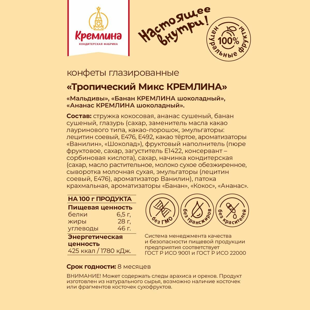 | Не содержит | ГМО / ароматизаторы / глутамат натрия / глютен / заменитель молочного жира / искусственные красители / лактозу / пальмовое масло / яйца |