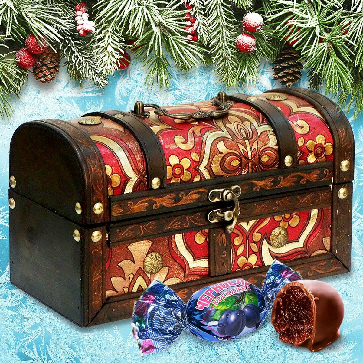 Конфеты Чернослив Шоколадный в подарочном наборе - резная деревянная шкатулка "Берендеево Царство. Зима", сладкий подарок, 150 гр
