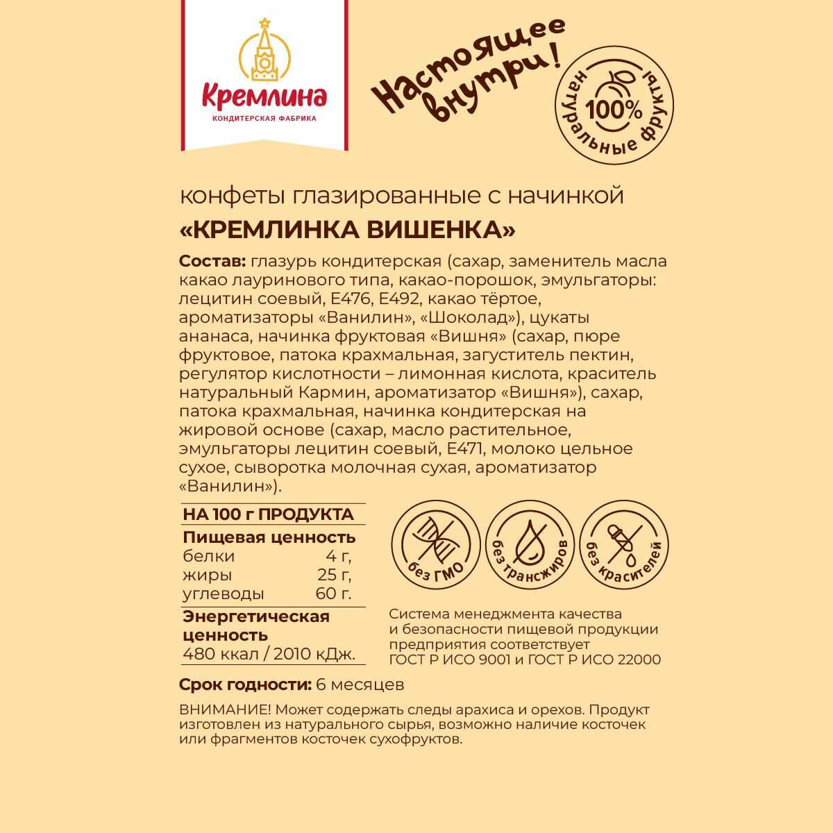 | Не содержит | ГМО / ароматизаторы / глутамат натрия / глютен / заменитель молочного жира / искусственные красители / лактозу / пальмовое масло / яйца |