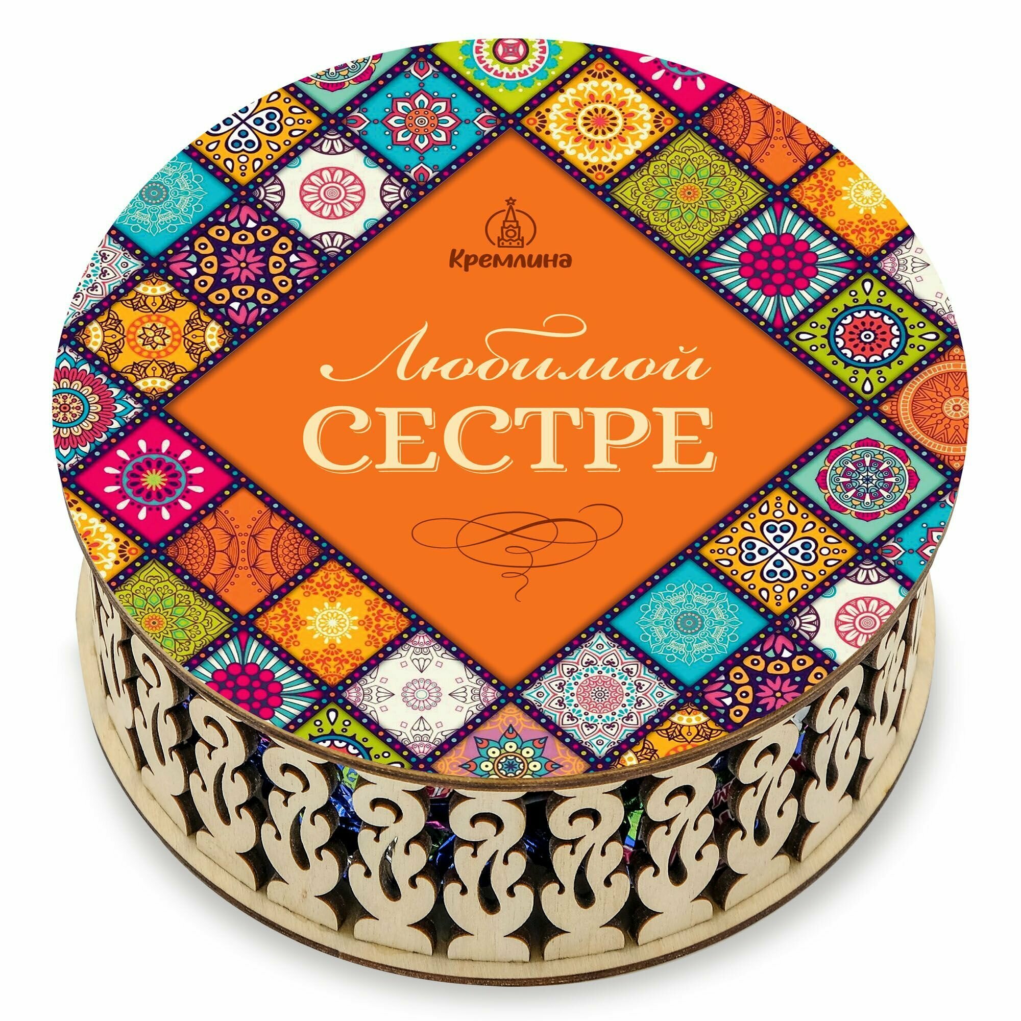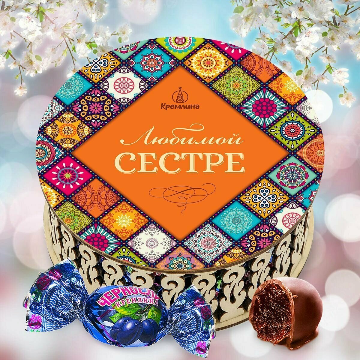 Набор подарочных конфет сестре на Новый Год Чернослив Шоколадный в резной шкатулке "Любимой сестре!", 400 грамм