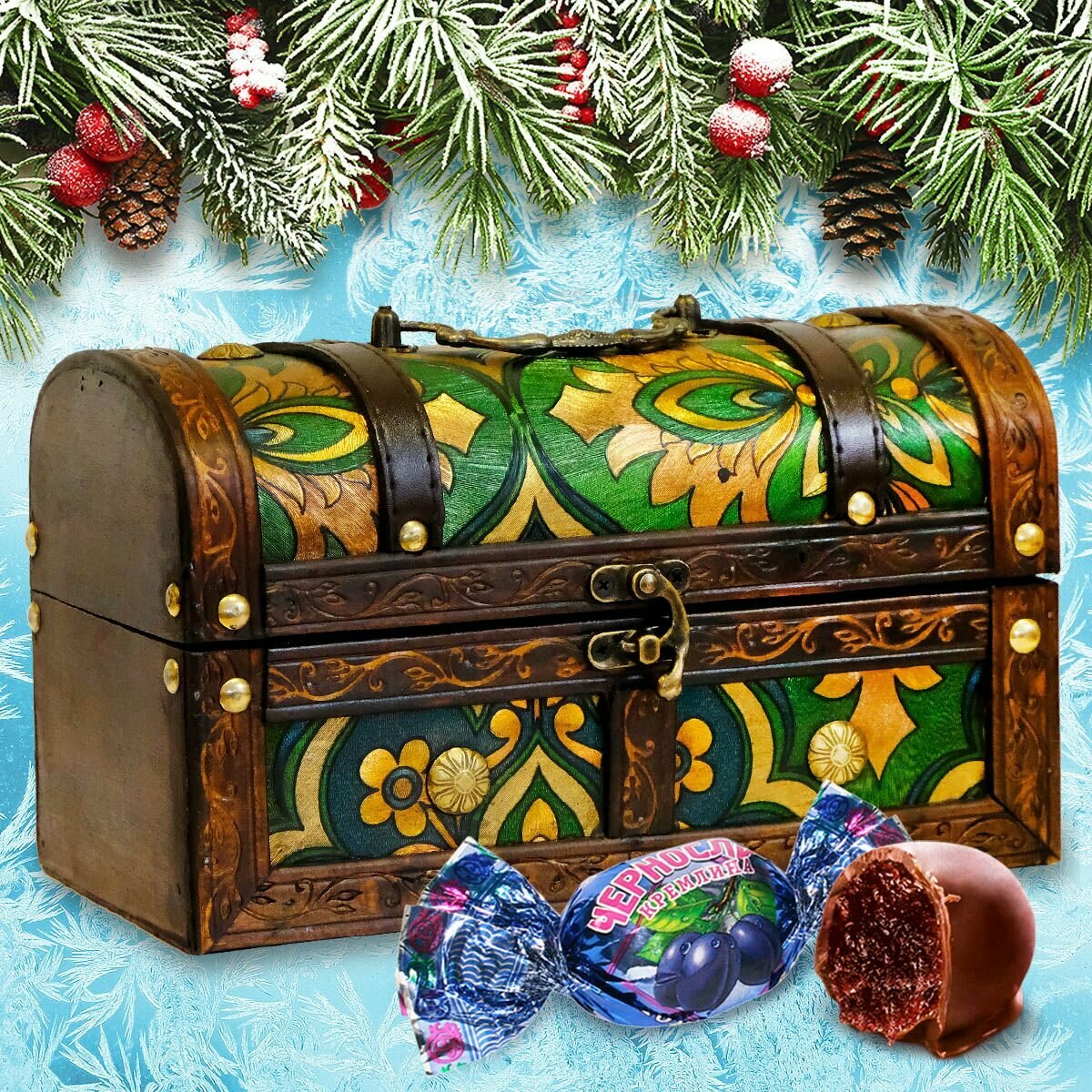 Купить Набор конфет подарочных Чернослив шоколадный в сундуке зеленом , 600 грамм