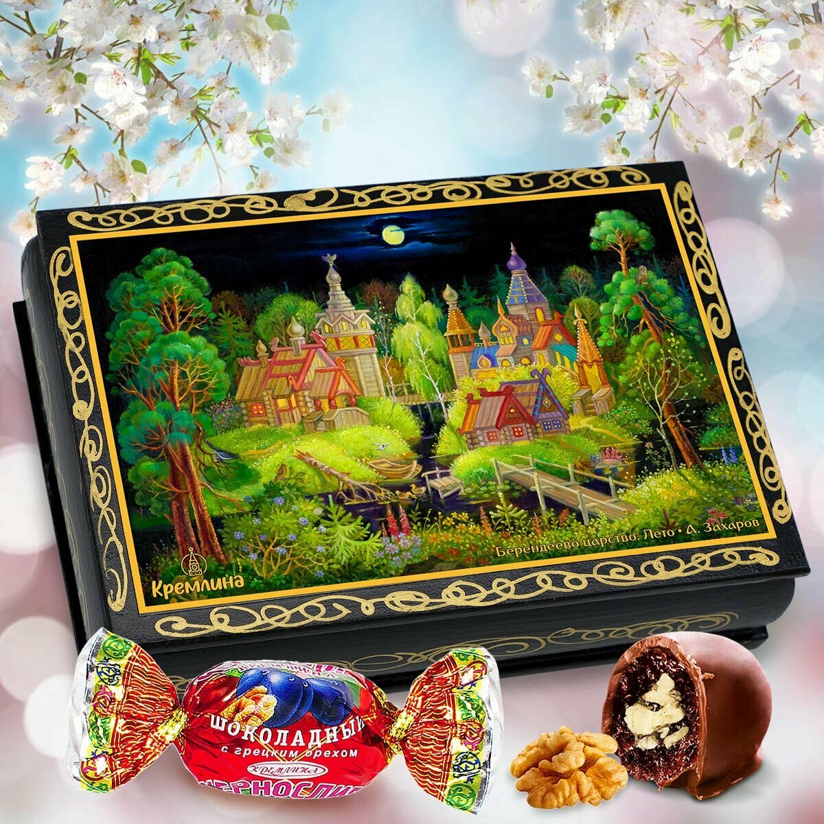 СохранитьНабор конфет подарочных Чернослив Шоколадный с грецким орехом в лаковой шкатулке "Берендеево Царство. Лето", 150 грамм интересное: