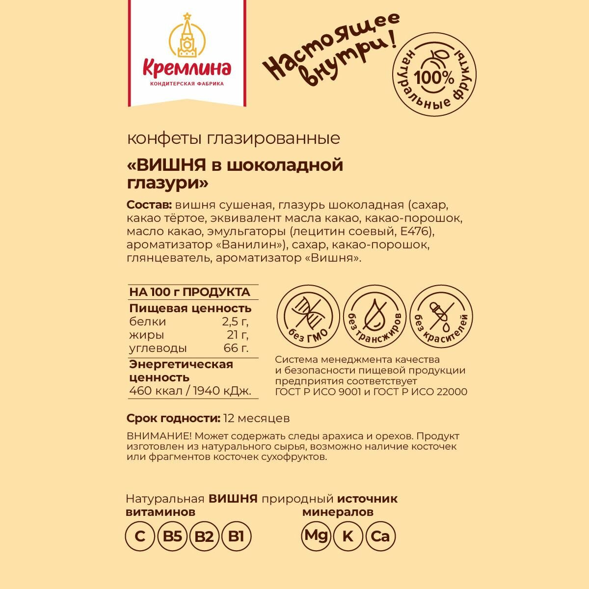 | Не содержит | ГМО / ароматизаторы / глутамат натрия / глютен / заменитель молочного жира / искусственные красители / лактозу / пальмовое масло / яйца |