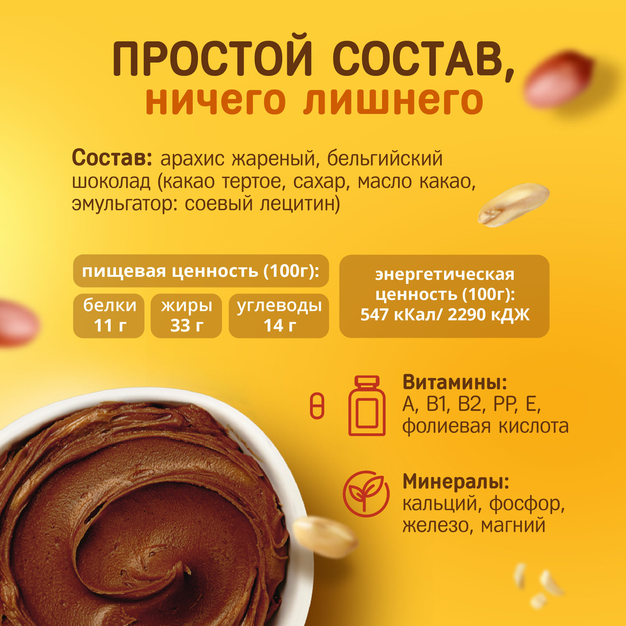 | Состав | жареный арахис, молочный шоколад |
