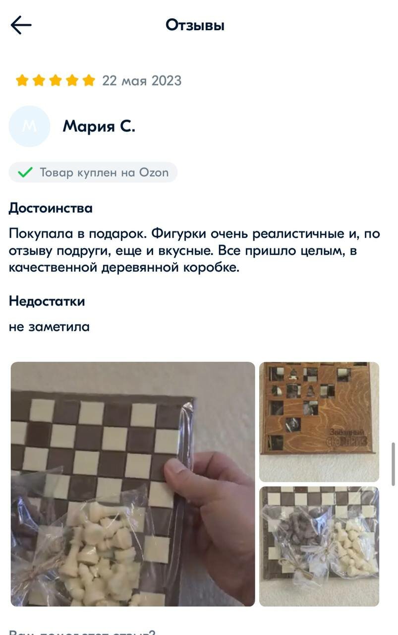 Ниже Вы можете прочитать отзывы на Шоколадные шахматы / шоколад фигурный / подарок, ознакомится с подробными характеристиками, посмотреть интересные обзоры и фотографии на Шоколадные шахматы / шоколад фигурный / подарок.