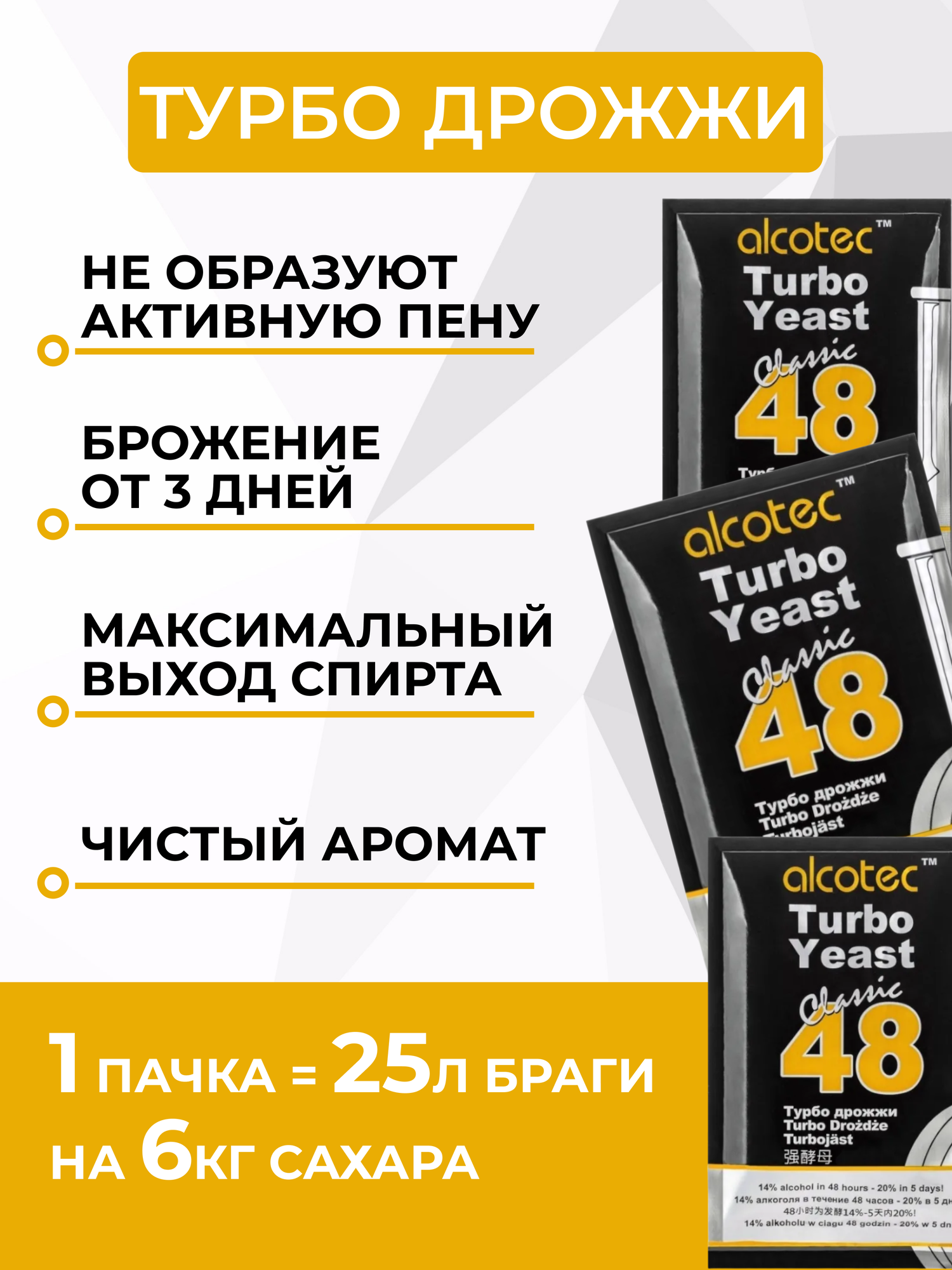 Спиртовые турбо дрожжи Alcotec Classic 48 Turbo/ Алкотек 48 дрожжи для самогона, для браги, для виски/ (комплект из 3 шт)