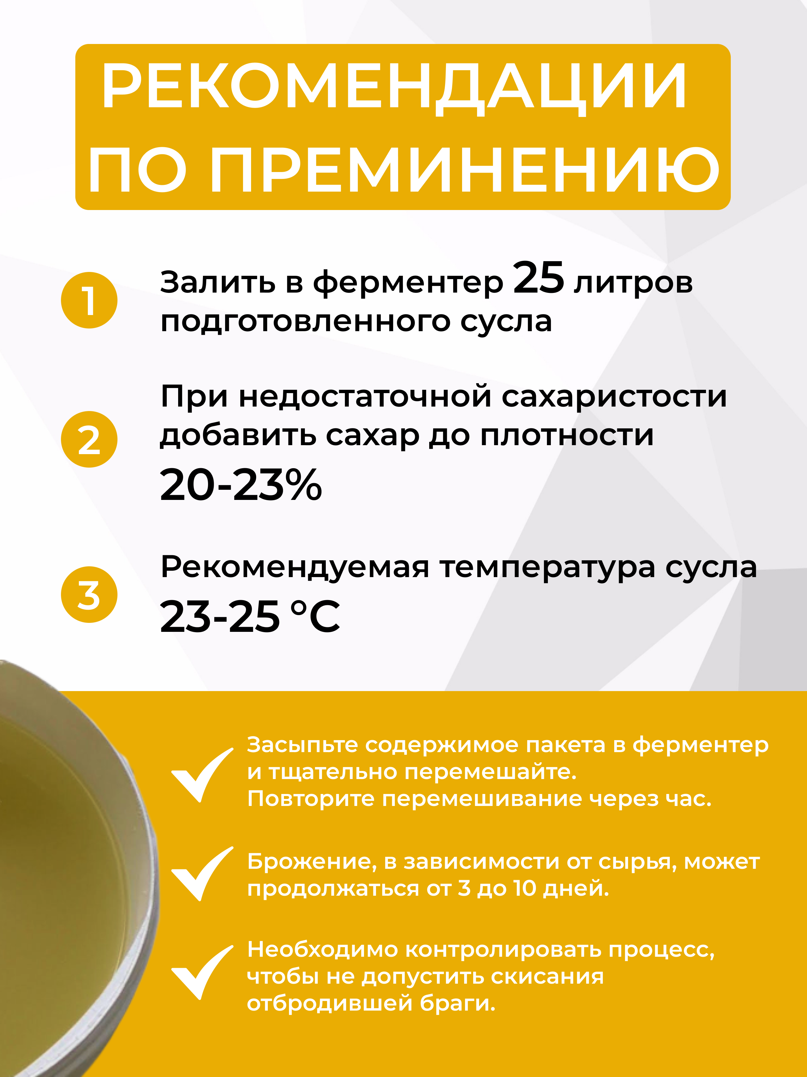 | Дополнительная информация | инструкция: налейте 15 л воды t 25 °С в ферментер. Добавьте необходимое количество сахара (согласно таблице) и размешайте до полного растворения. Доведите общий объём воды до 25 л и обеспечьте необходимую согласно таблице температуру. Всыпьте в раствор дрожжи. Не закрывайте ферментер плотно и не используйте гидрозатвор. Чтобы получить брагу крепостью 21% необходимо постоянно поддерживать температуру в пределах 18-24°С. Для обеспечения этого условия необходимо специальное охлаждающее оборудование. |