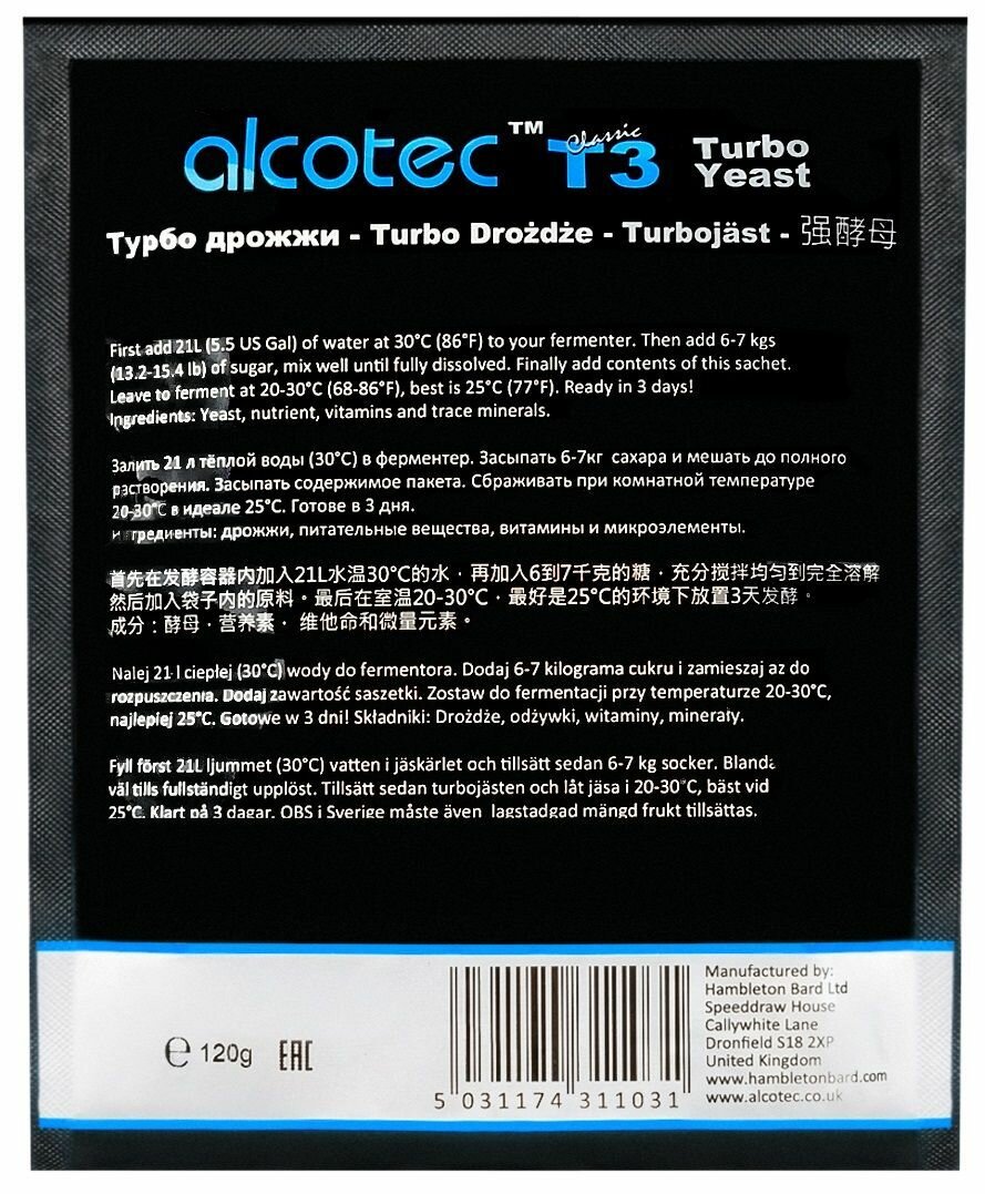 Дрожжи спиртовые ALCOTEC T3 Turbo / Алкотек Т3 Турбо, 1 упаковка