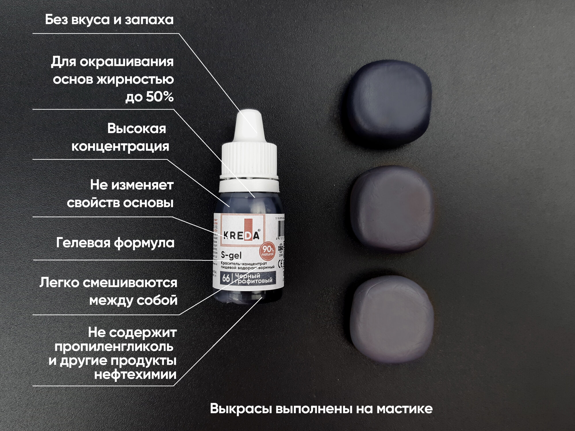 Ниже Вы можете прочитать отзывы на Пищевой краситель Kreda S-gel, чёрный графитовый, 10 мл, гелевый, водорастворимый, ознакомится с подробными характеристиками, посмотреть интересные обзоры и фотографии на Пищевой краситель Kreda S-gel, чёрный графитовый, 10 мл, гелевый, водорастворимый.