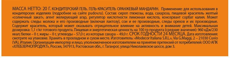 СохранитьГель-краситель пищевой EXTRA Оранжевый мандарин С.Пудовъ, Италия, тюбик/картон, 0,02 кг интересное: