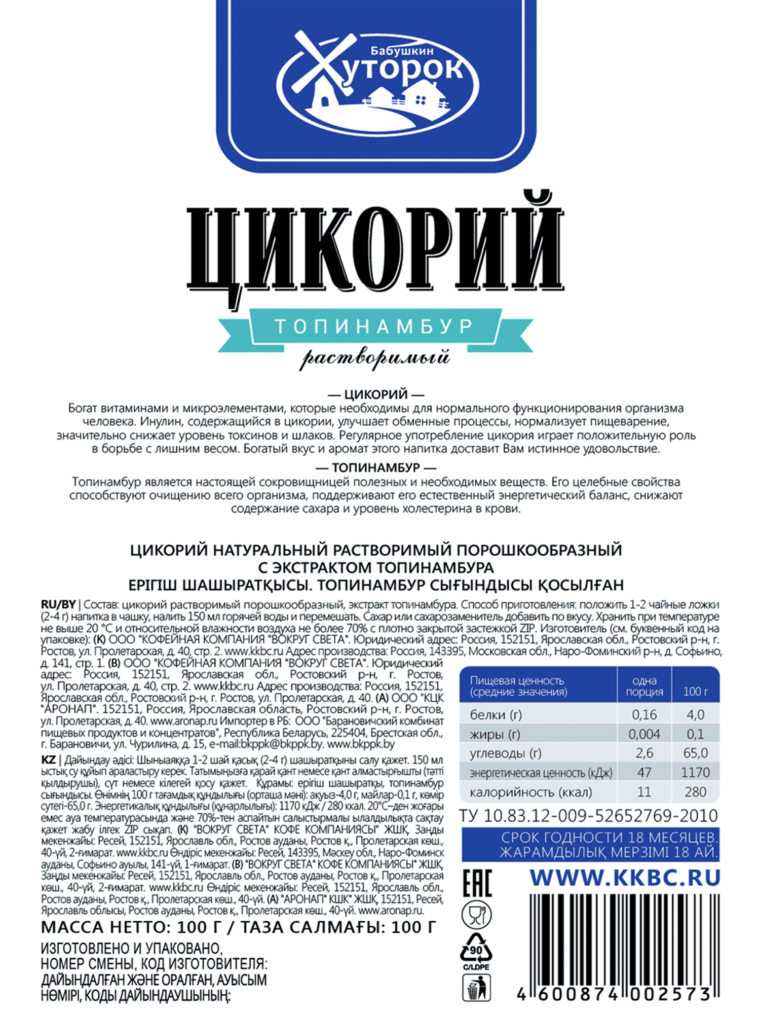 Цикорий "Бабушкин Хуторок", с топинамбуром, растворимый, без кофеина, 100 гр
