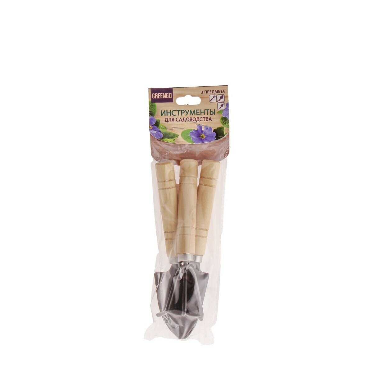 Набор садового инструмента, 3 предмета: рыхлитель, 2 совка, длина 20 см, деревянные микс ручки, Greengo