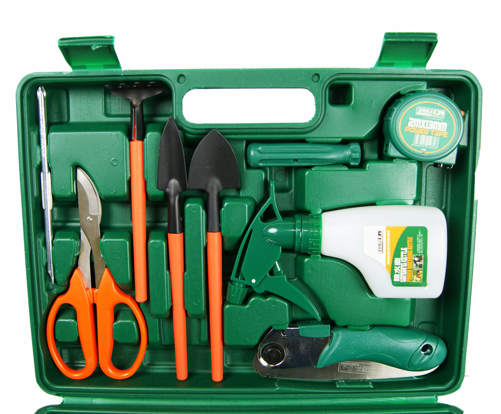 | Дополнительная информация | в комплекте: отвертка со сменной головкой, садовые ножницы, мини-совок широкий, мини-шпатель, мини-грабли, рулетка, бутылка для полива с распылителем, пила складная, садовая лопатка из нержавеющей стали, садовые грабли из нержавеющей стали, садовый дозатор из нержавеющей стали, кейс; размер кейса: 350х265х80 мм |