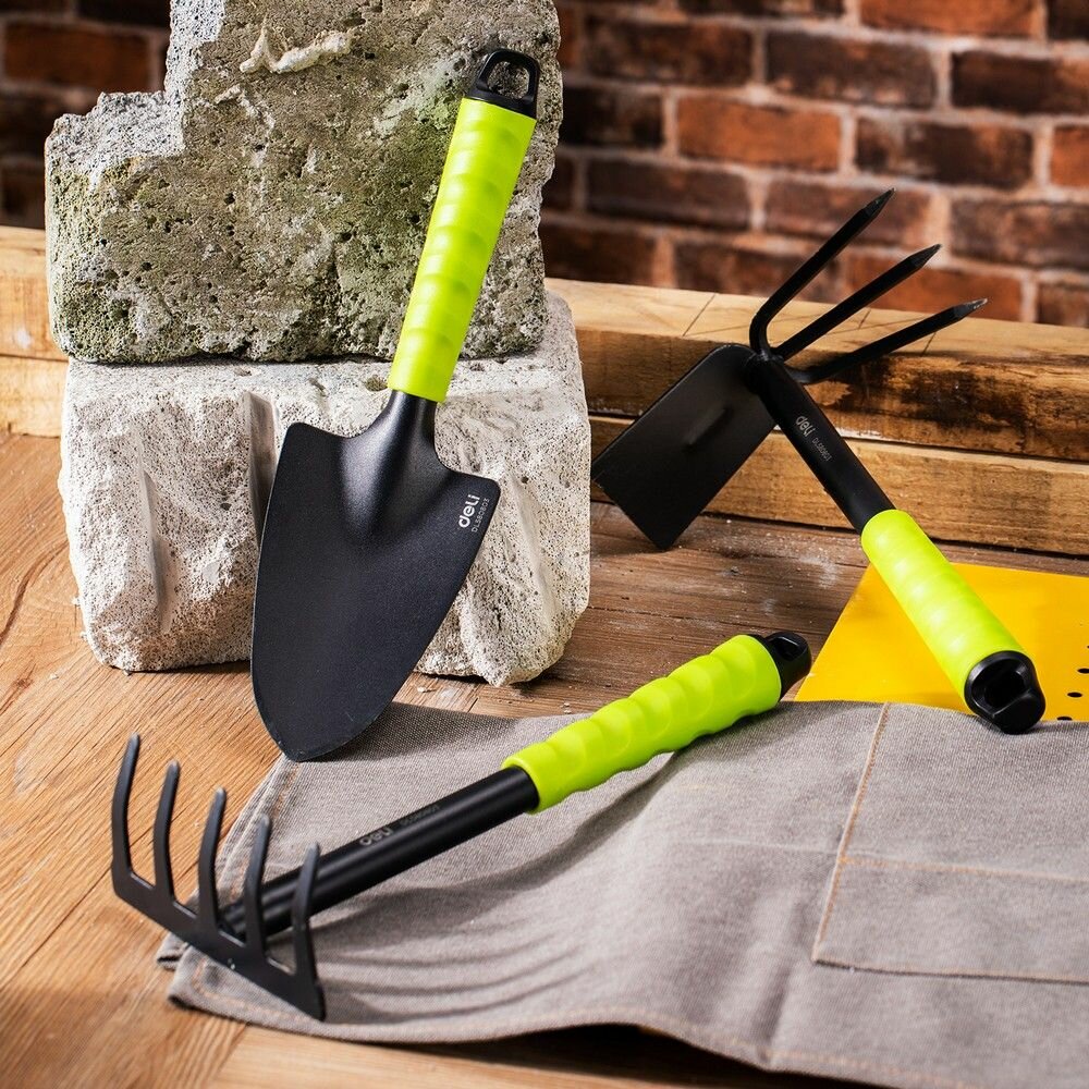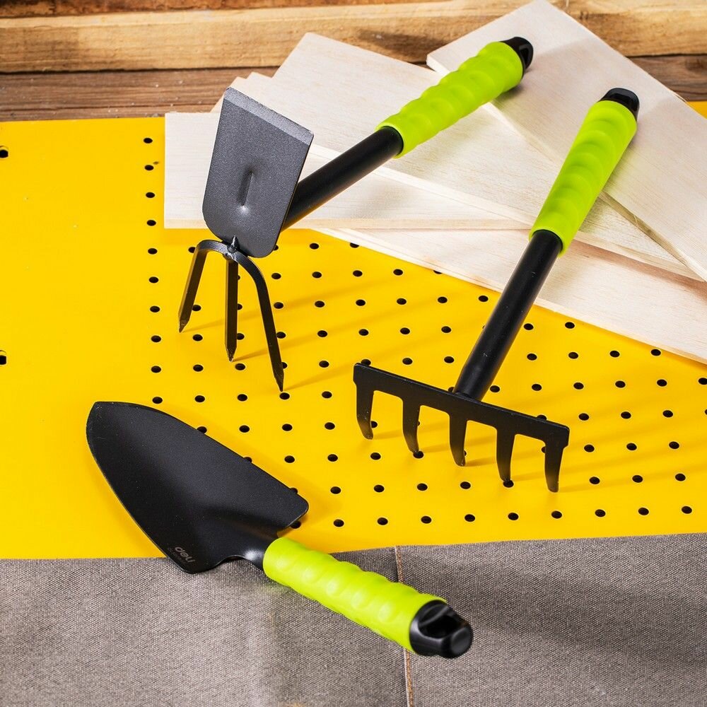 Купить Набор садового инструмента (лопатка, двусторонняя мотыжка, пятизубчатые грабли) Deli DL580803 длина 31 см