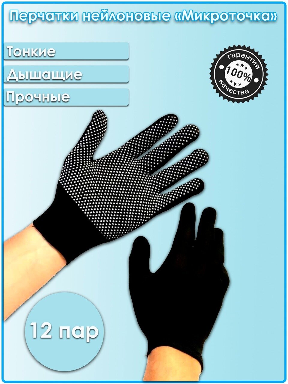 Перчатки нейлоновые "Микроточка" черные , 24 пары / перчатки хозяйственные / перчатки строительные / перчатки рабочие / перчатки садовые / перчатки защитные