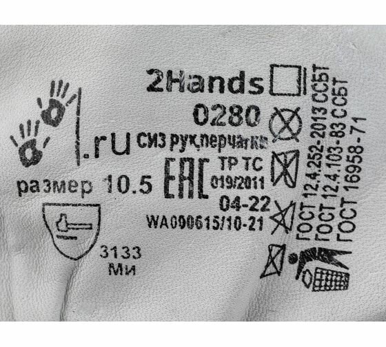 | Материал покрытия перчаток | натуральная кожа сорта АВ (1,2 мм +/- 0,2 мм) белого цвета |