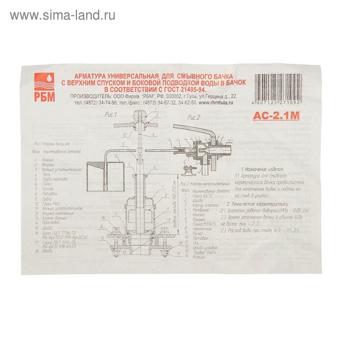 Арматура для смывных бачков "РБМ" АС-2.1 М, с боковым мембранным клапаном, хром интересное: