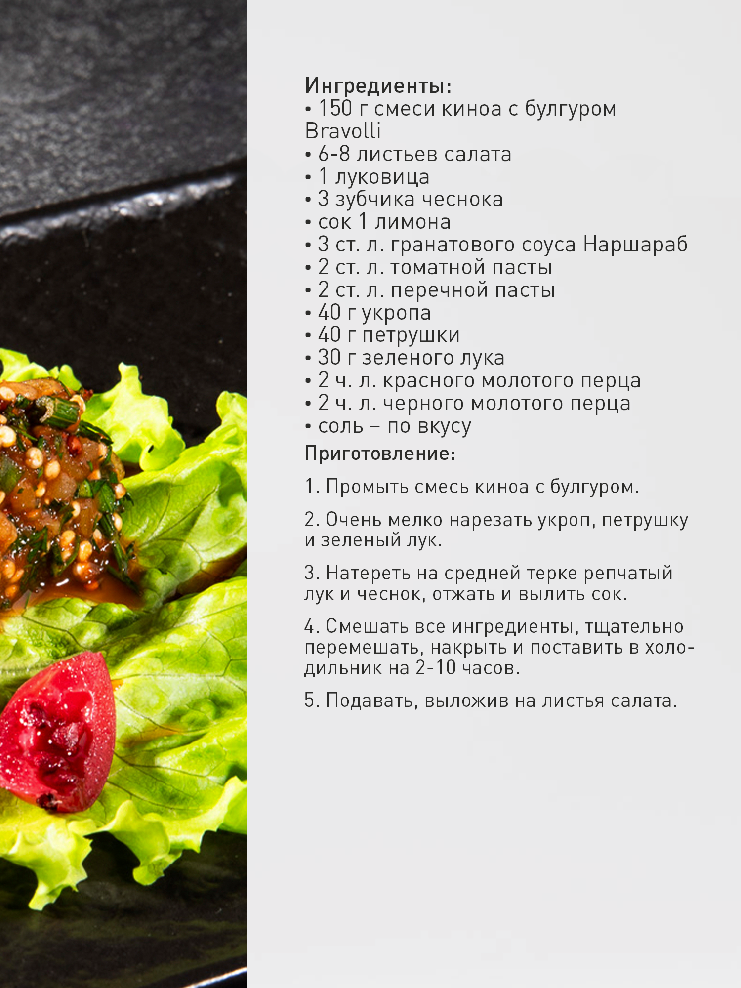 | Состав | киноа, булгур. Содержит глютен, может содержать следы сельдерея, сои, горчицы, арахиса, кунжута, орехов, молока и продуктов его переработки, яиц и продуктов их переработки. |