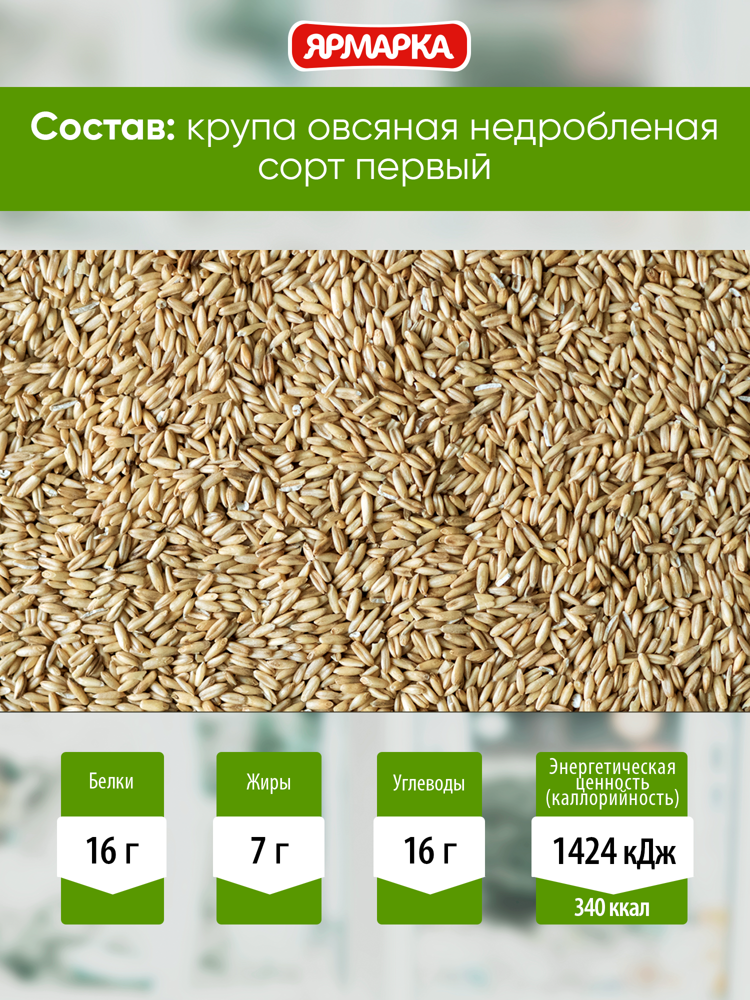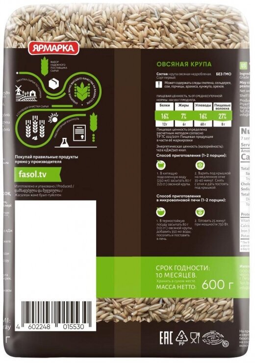 | Состав | крупа овсяная недробленая. Сорт первый. Содержит глютен, может содержать следы сельдерея, сои, горчицы, арахиса, кунжута, орехов, молока и продуктов его переработки, яиц и продуктов их переработки. |