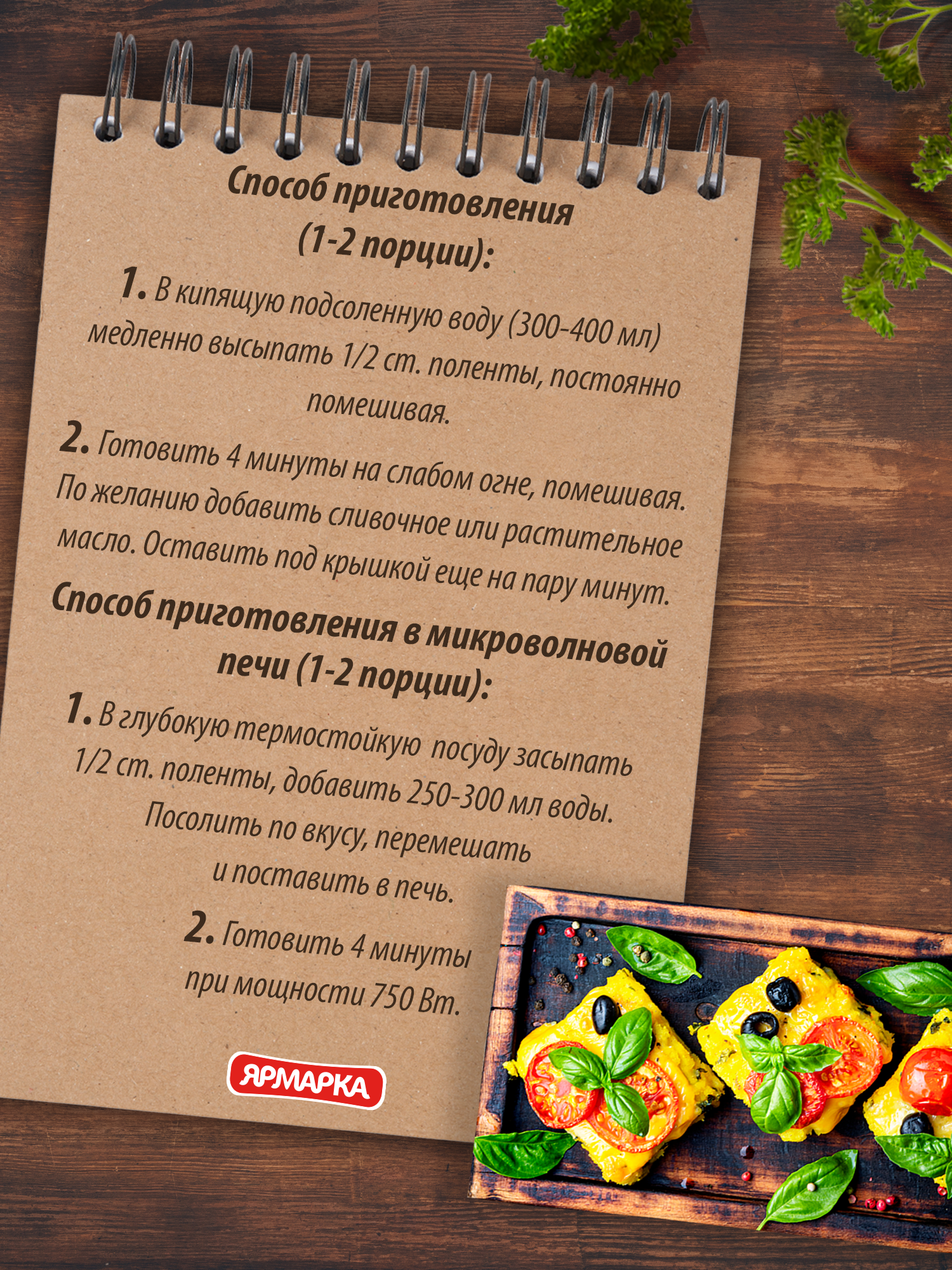 | Способ приготовления | В кипящую подсоленную воду медленно высыпать поленту, постоянно помешивая, готовить 4 минуты на слабом огне, помешивая. По желанию добавить сливочное или растительное масло. Оставить под крышкой еще на пару минут. |