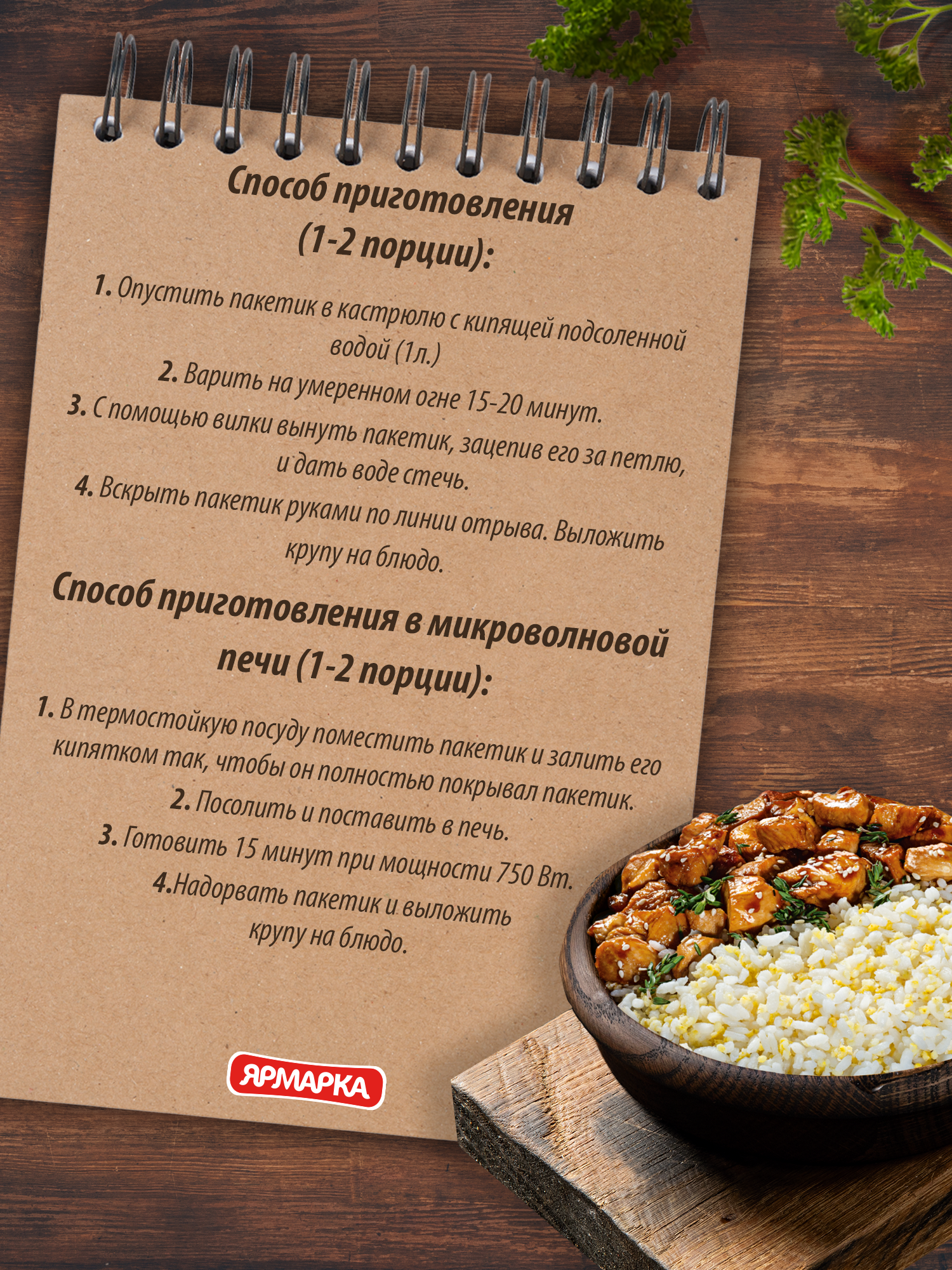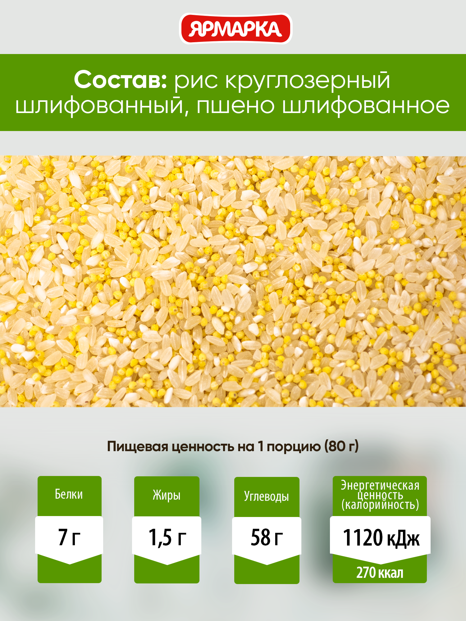 | Состав | рис круглозерный шлифованный, пшено шлифованное. Может содержать следы глютена, сельдерея, сои, горчицы, арахиса, кунжута, орехов, молока и продуктов его переработки, яиц и продуктов их переработки. |