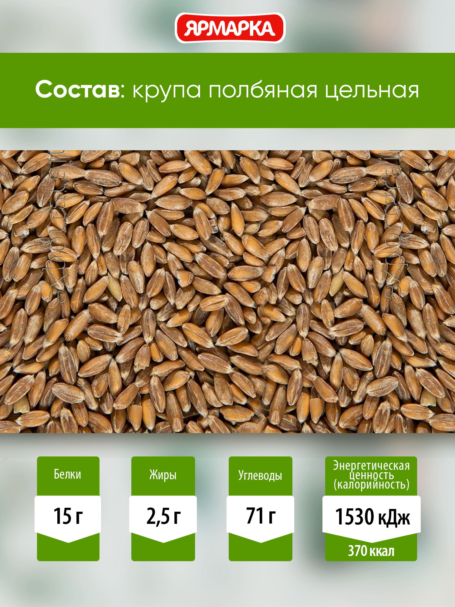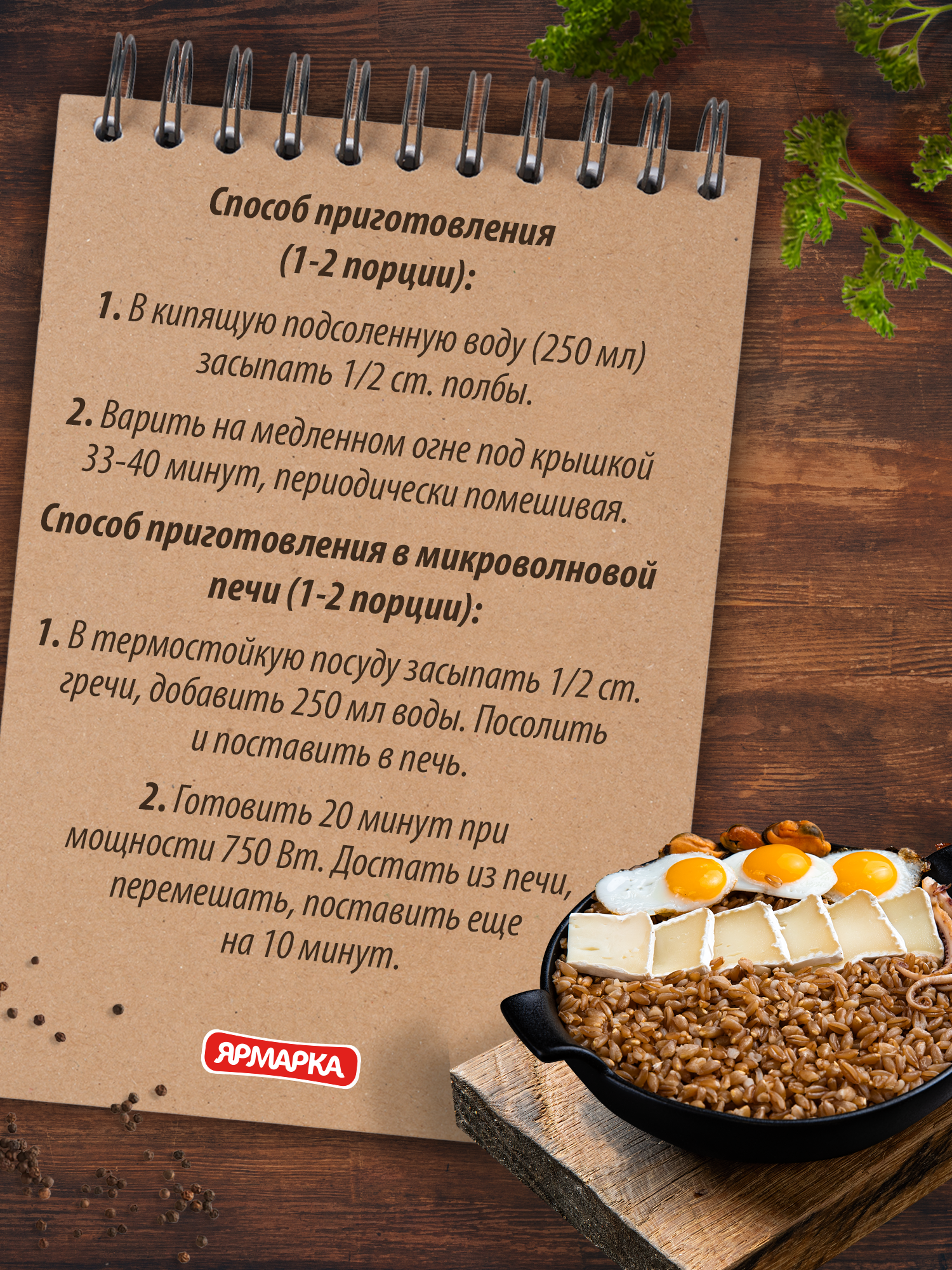 | Способ приготовления | Способ приготовления (1-2 порции): 1. В кипящую подсоленную воду (250 мл) засыпать 1/2 ст. полбы. 2. Варить на медленном огне под крышкой 35-40 минут, периодически помешивая. |