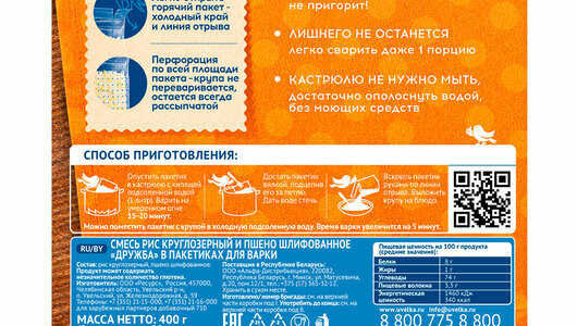 | Дополнительная информация | рис круглозерный (72%), пшено шлифованное (28%); упаковка может иметь несколько видов дизайна, поставка осуществляется в зависимости от наличия на складе |