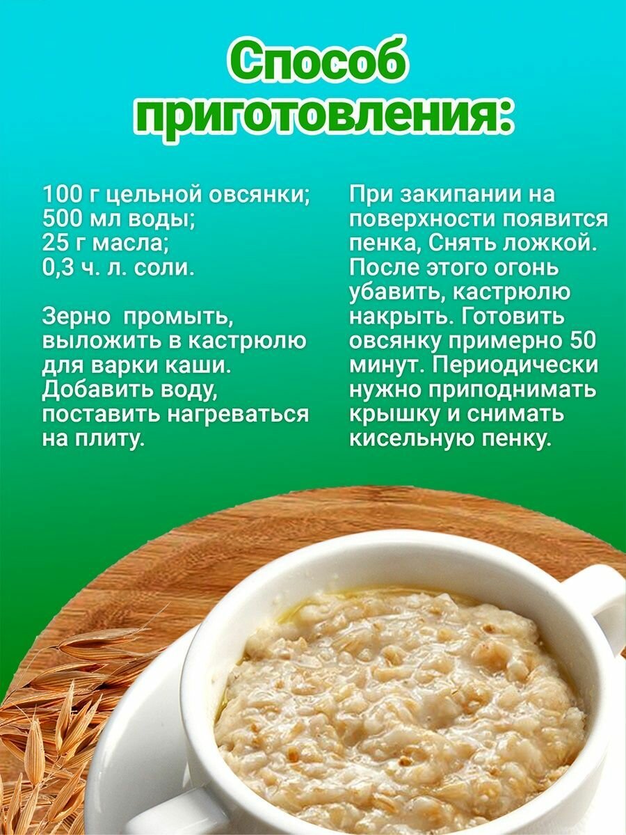 | Способ приготовления | Залейте овсяную крупу в кастрюле 1 л отфильтрованной или бутилированной воды. Оставьте на 8–10 ч. Шаг 2 Поставьте кастрюлю с крупой и водой на сильный огонь. Доведите до кипения, посолите, уменьшите огонь до слабого, закройте крышкой, варите 15–25 мин., до желаемой степени мягкости/разваренности зерна. Шаг 3 Добавьте в кашу сливочное масло по вкусу (но не меньше 40 г) и сахар, если хотите. Выключите огонь, оставьте кашу под крышкой и теплым полотенцем на 5 мин. |