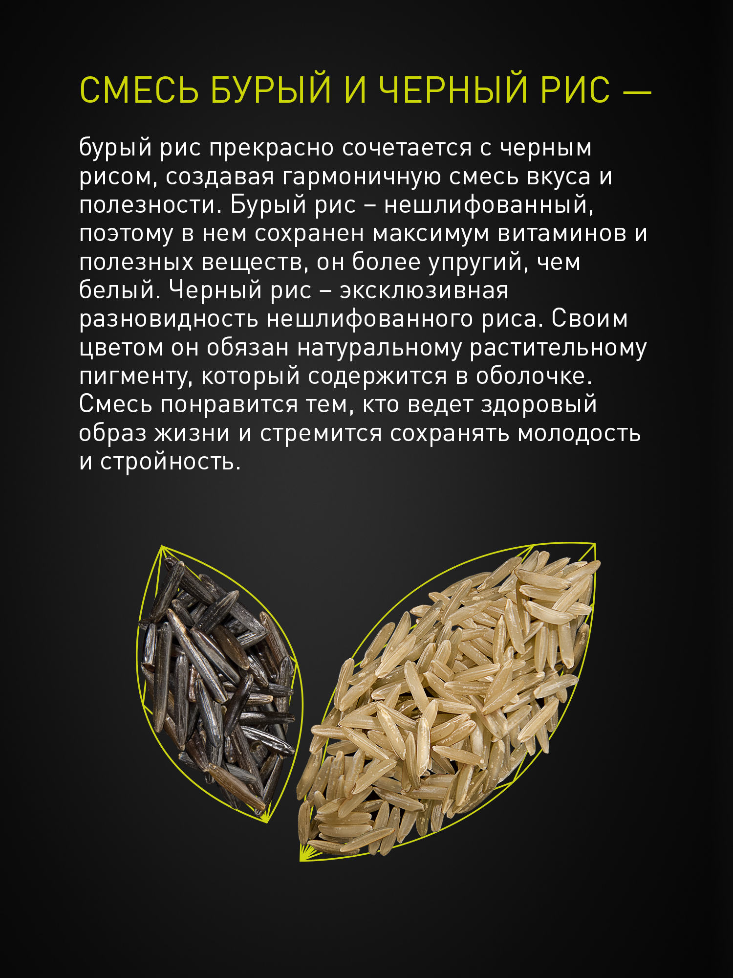 | Состав | рис бурый нешлифованный, рис черный нешлифованный. Может содержать следы глютена, сельдерея, сои, горчицы, арахиса, кунжута, орехов, молока и продуктов его переработки, яиц и продуктов их переработки. |
