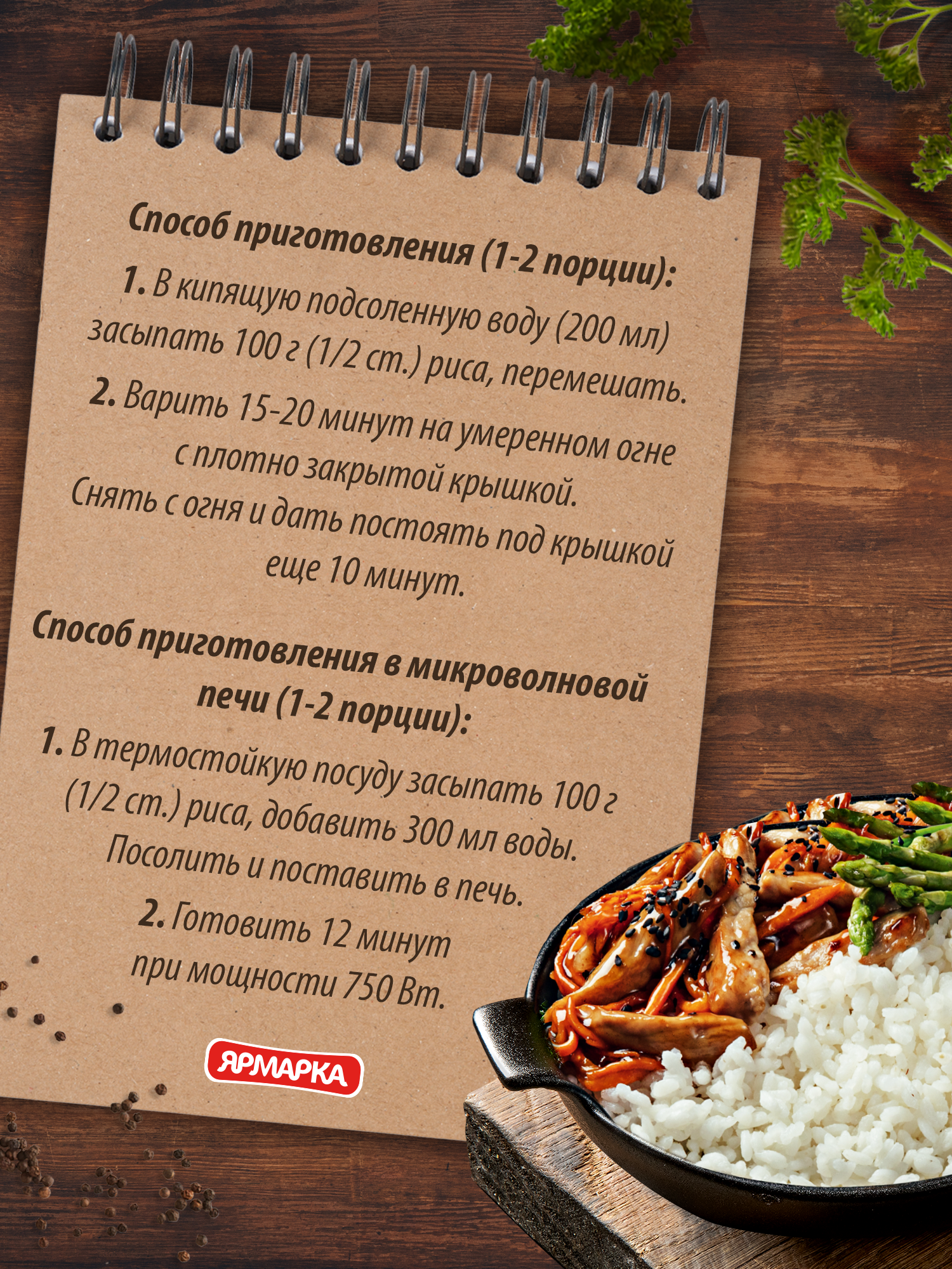 | Способ приготовления | В кипящую подсоленную воду засыпать рис, перемешать, варить на умеренном огне под плотной крышкой 15-20 минут, снять с огня и дать постоять под крышкой еще 10 минут. |