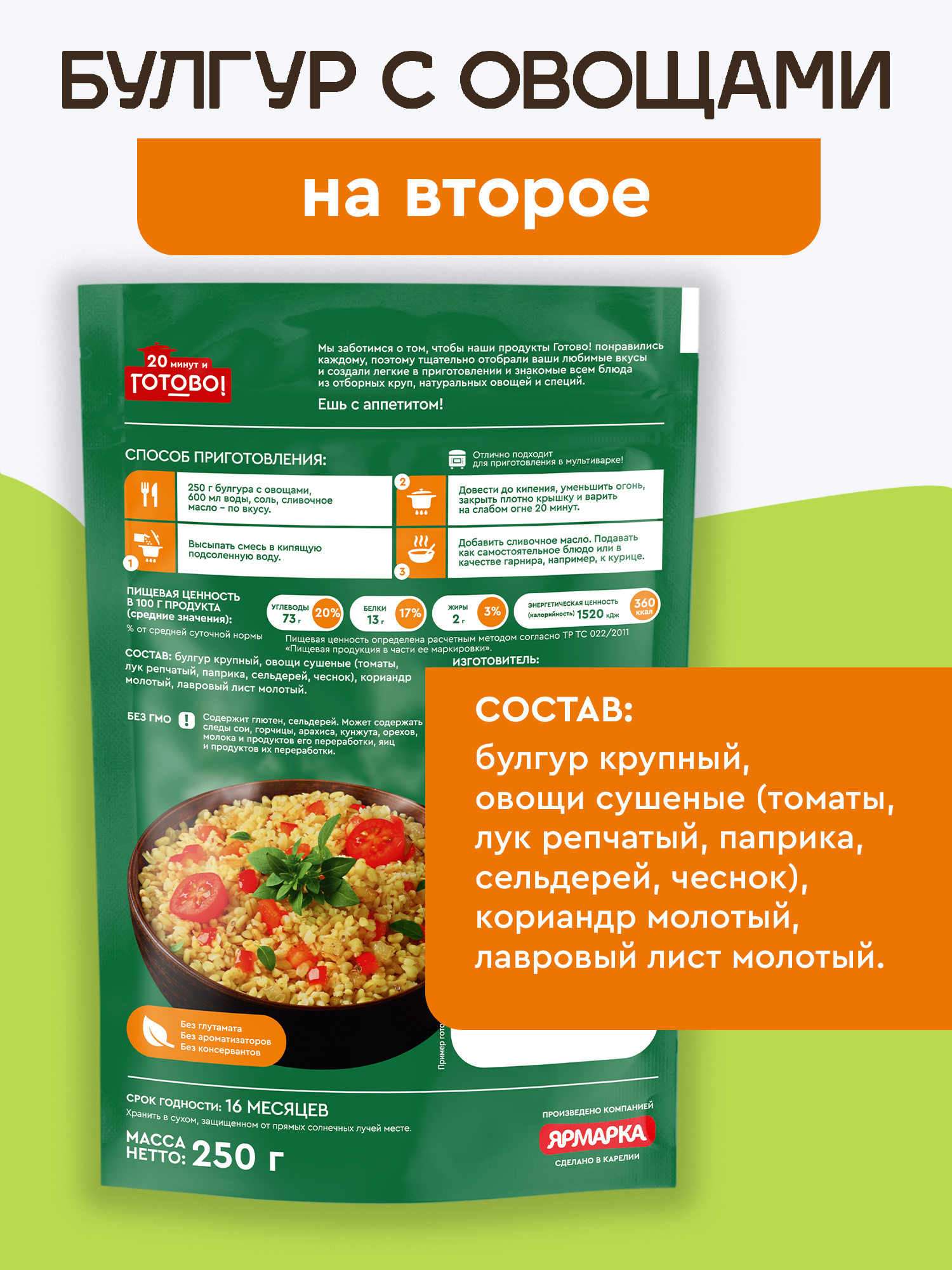 | Состав | Булгур крупный, пшеничная крупа, овощи сушеные (томаты, лук репчатый, паприка красная, чеснок), кориандр молотый |