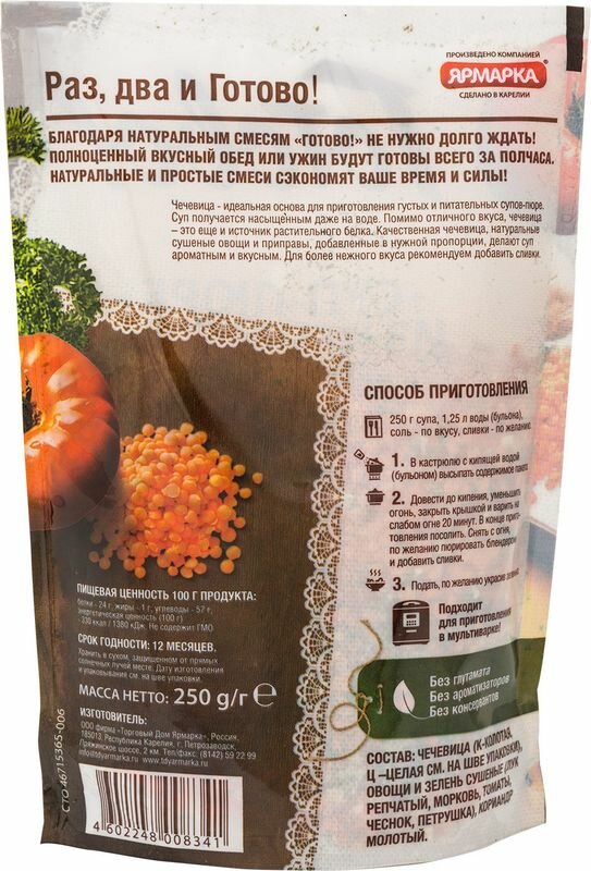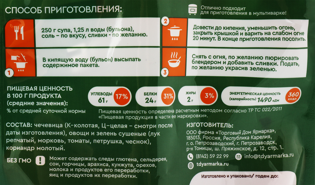 | Состав | чечевица, овощи и зелень сушеные (лук репчатый, морковь, томаты, петрушка, чеснок), кориандр молотый. Может содержать следы глютена, сельдерея, сои, горчицы, арахиса, кунжута, орехов, молока и продуктов его переработки, яиц и продуктов их переработки. |