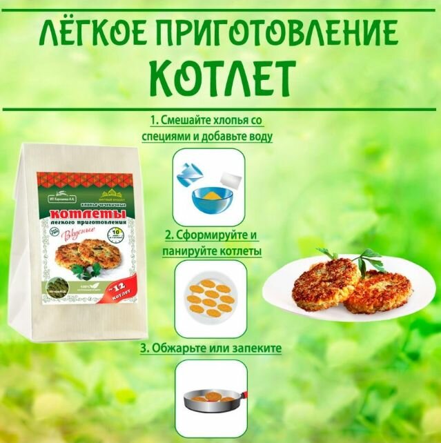| Способ приготовления | 1) Смешайте в посуде содержимое большого пакета с хлопьями и малого пакета со специями (тертые овощи и зелень добавьте по желанию); 2) Добавьте 400 мл горячей воды, молока, сыворотки или сливок; 3) Тщательно перемешайте и оставьте для набухания на несколько минут. Если жидкости меньше нормы, котлеты будут суховаты, если больше - потребуется еще немного времени для набухания; 4) Сформируйте котлеты толщиной около 1-1,5 см; 5) Панируйте в сухарях и обжаривайте на сковороде в хорошо разогретом масле на сильном огне до образования румяной корочки (3-5 минут). Подавать можно с томатным соусом. |