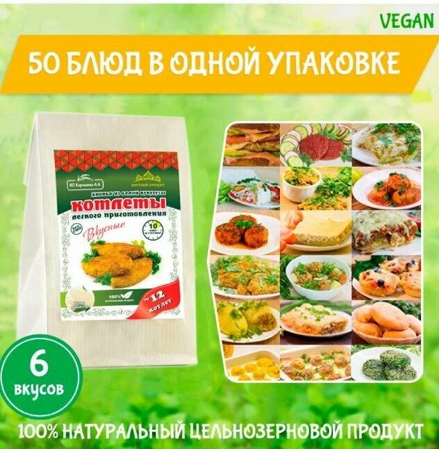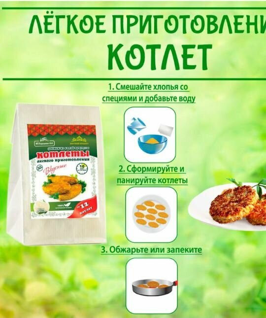 | Способ приготовления | 1) Смешайте в посуде содержимое большого пакета с хлопьями и малого пакета со специями (тертые овощи и зелень добавьте по желанию); 2) Добавьте 400 мл горячей воды, молока, сыворотки или сливок; 3) Тщательно перемешайте и оставьте для набухания на несколько минут. Если жидкости меньше нормы, котлеты будут суховаты, если больше - потребуется еще немного времени для набухания; 4) Сформируйте котлеты толщиной около 1-1,5 см; 5) Панируйте в сухарях и обжаривайте на сковороде в хорошо разогретом масле на сильном огне до образования румяной корочки (3-5 минут). Подавать можно с томатным соусом. |