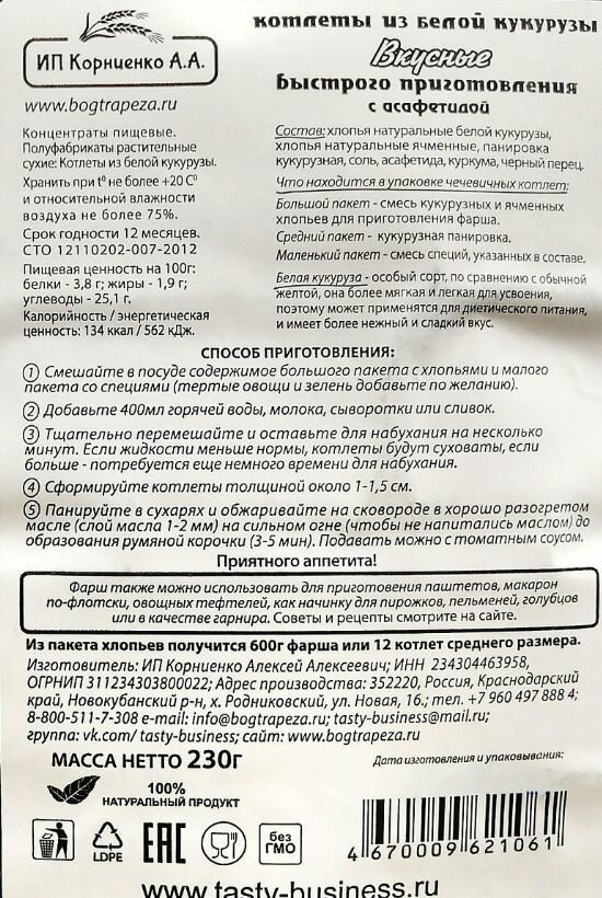 Купить Котлеты из белой кукурузы с чесноком 230 гр (ИП Корниенко А.А.) (2 шт. в наборе)